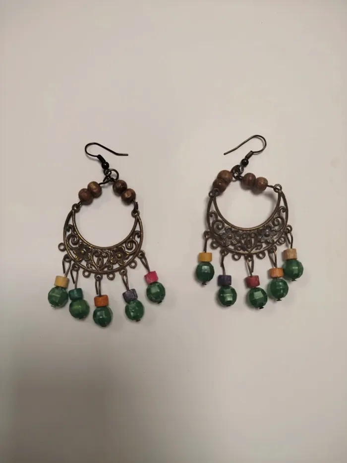 Composées de perles en bois naturel et de perles vertes en résine facettée, associées à des petites perles carrées colorées (jaune, rose, violet). Système crochet pour oreilles percées. Légères à porter, parfaites pour accessoiriser un look d'été, bohème ou vintage. Légères traces d’oxydation discrètes.