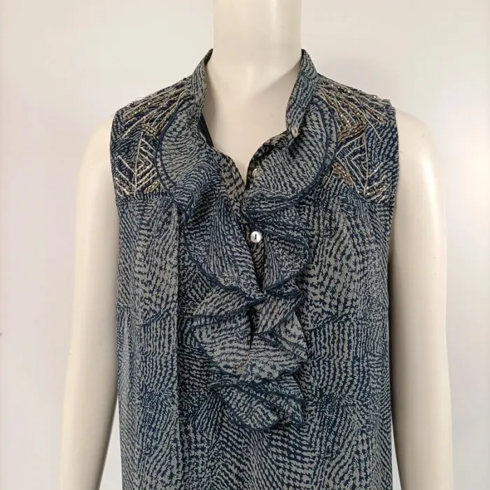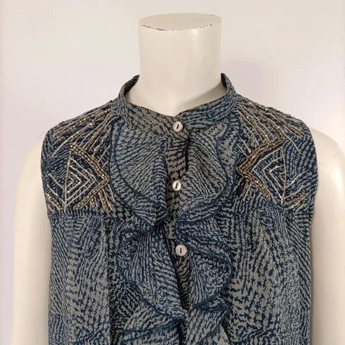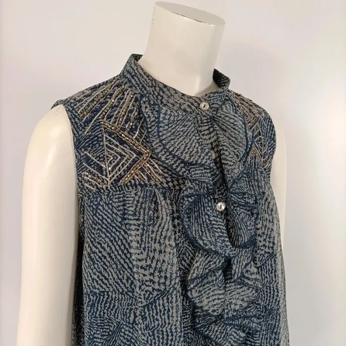 Robe sans manches imprimée bleu Ange taille M col volanté fluide légère chic A112