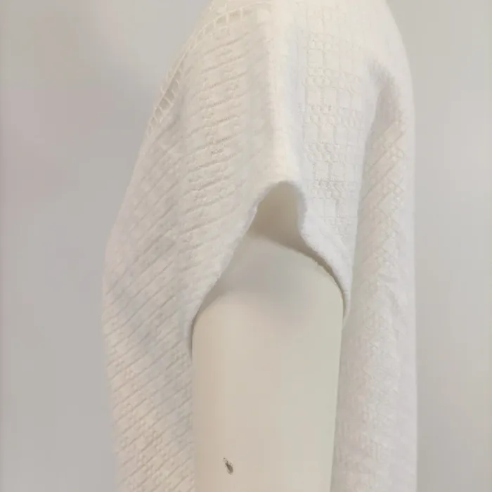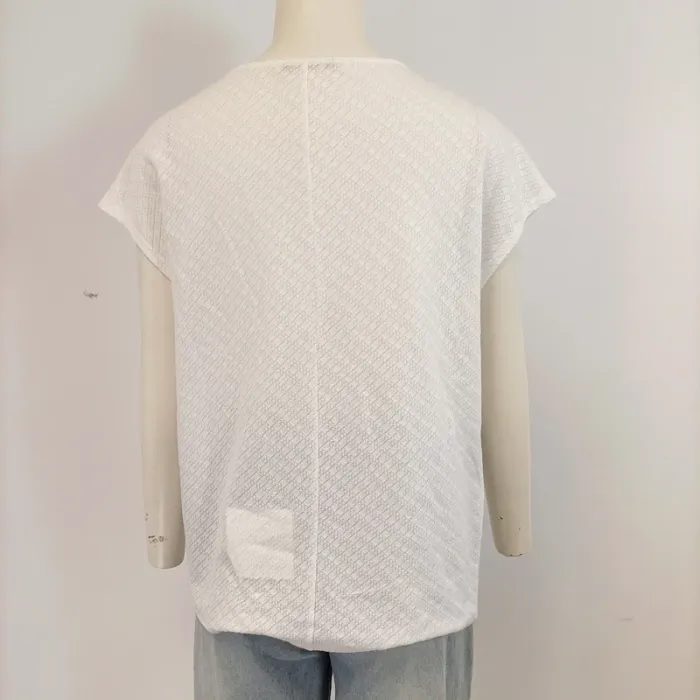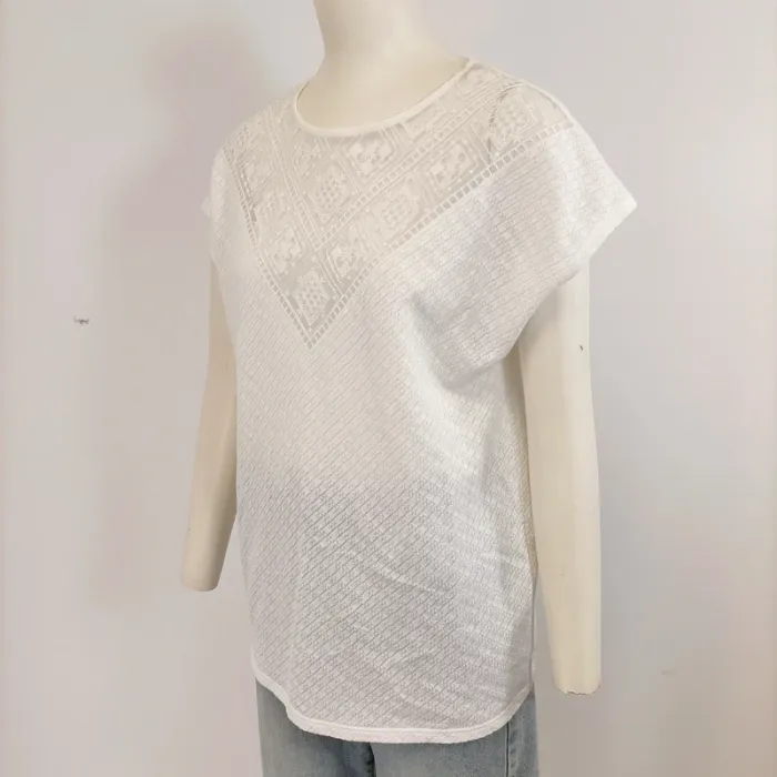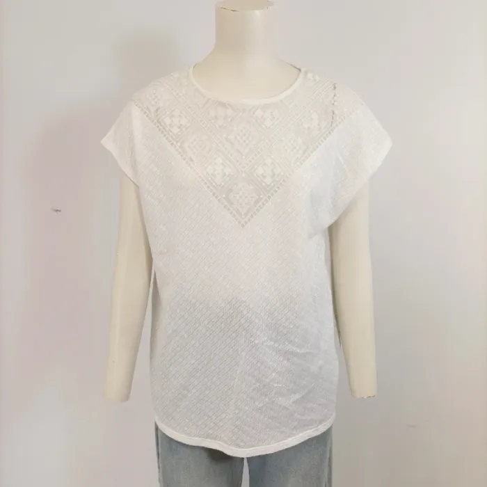Top blanc cassé à manches courtes effet sans manches. Matière légère en maille très fine texturée type jacquard avec détails géométriques ton sur ton et empiècement travaillé façon broderie sur le devant. Coupe droite légèrement arrondie sur le bas, col rond classique. Parfait avec un jean taille haute ou une jupe midi fluide pour un look casual chic et estival.