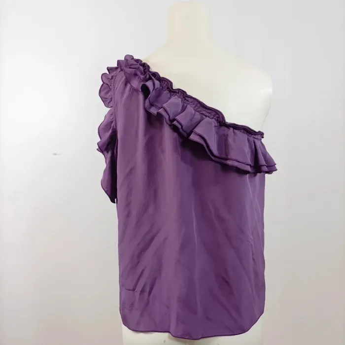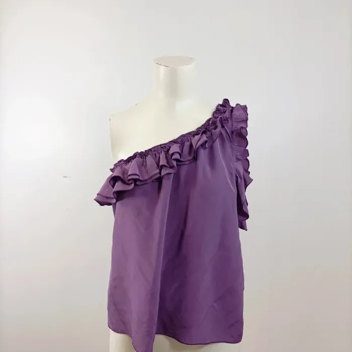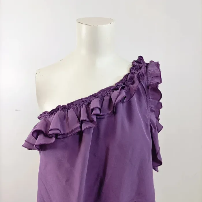 Mots-clés : top asymétrique, top violet Gérard Darel, blouse une épaule, haut à volant, top élégant soirée, top chic femme, haut fluide violet, blouse tendance été, top marque, haut raffiné