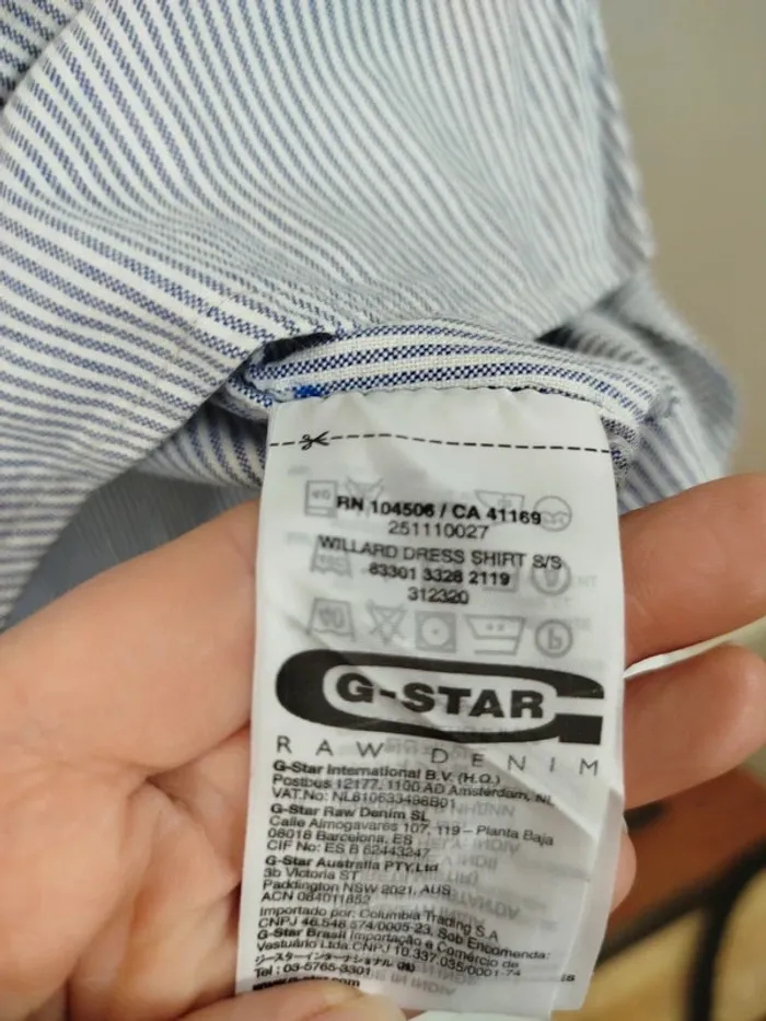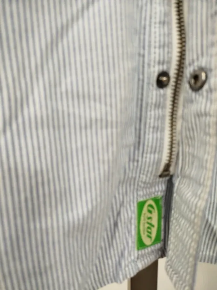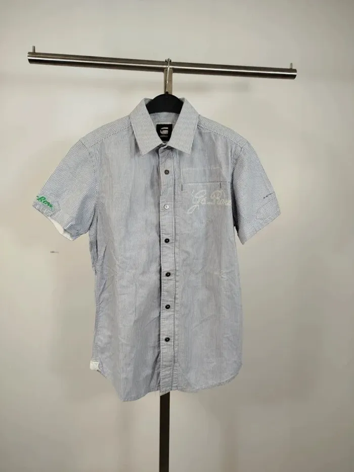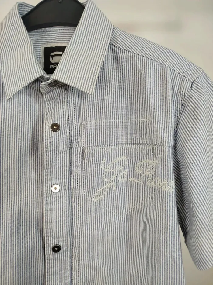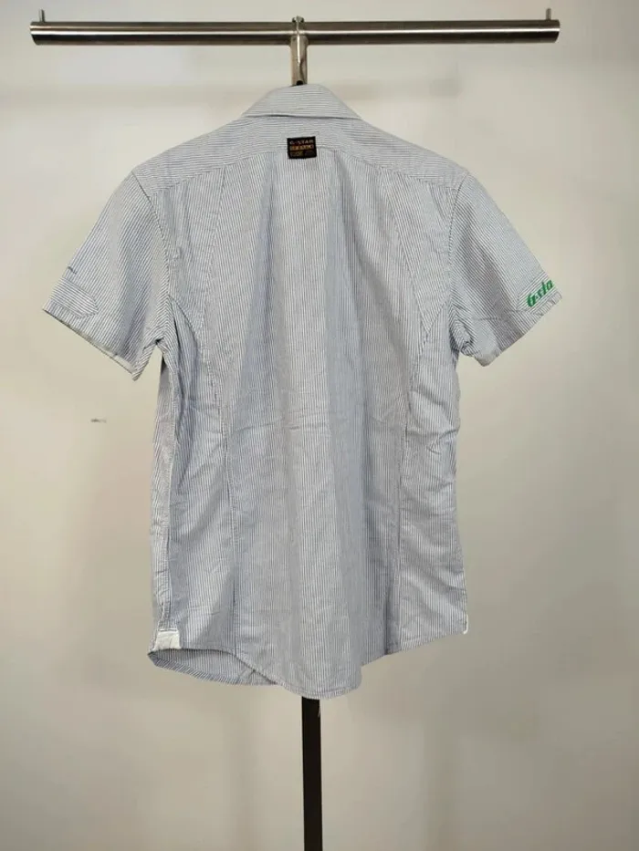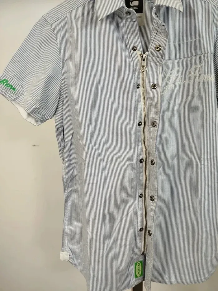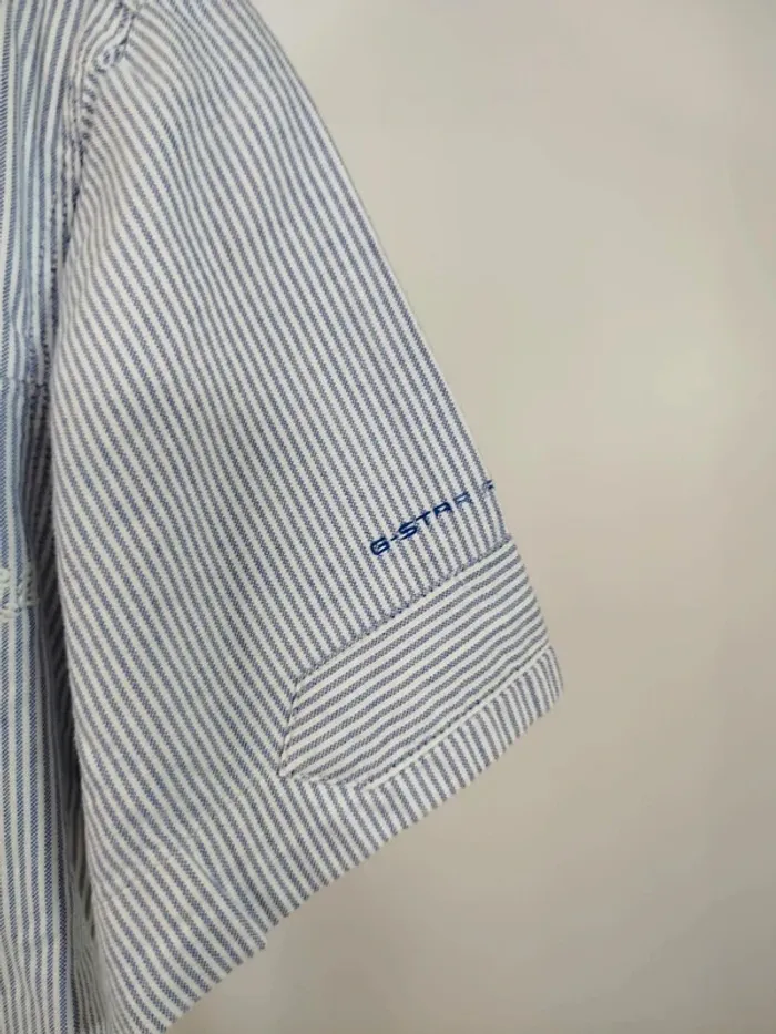 ⚠️ LIRE ATTENTIVEMENT LA DESCRIPTION ⚠️ 🚀 Envoi rapide 💎 État 10/10 - comme neuf. Chemise à manches courtes pour femme de la marque G-Star Raw. Taille S. Motif à fines rayures bleues et blanches, coupe droite, col classique, fermeture boutonnée, poche poitrine avec logo brodé. Détails graphiques sur la manche gauche et patchs cousus. Petite fermeture éclair décorative sur le côté. Toutes les ventes sont reversées intégralement à l'association Amitié Partage, association à but non lucratif qui vient en aide aux plus démunis. Votre achat n'est pas seulement un vêtement, c'est un véritable soutien à notre association.