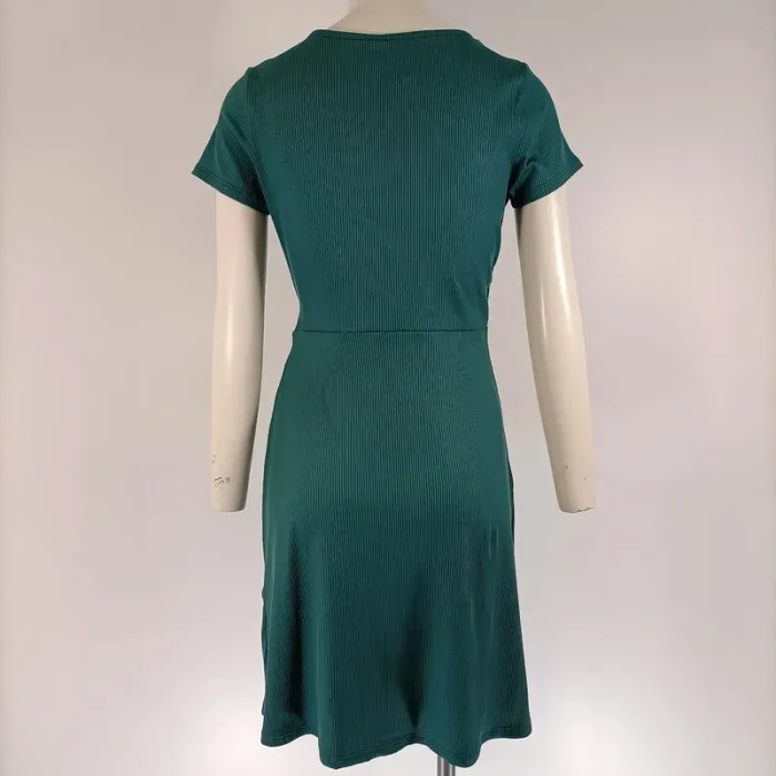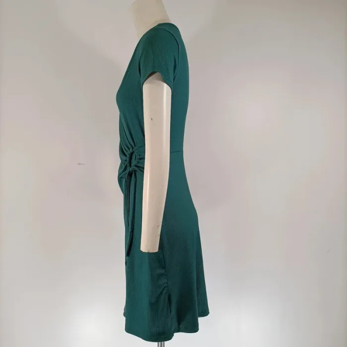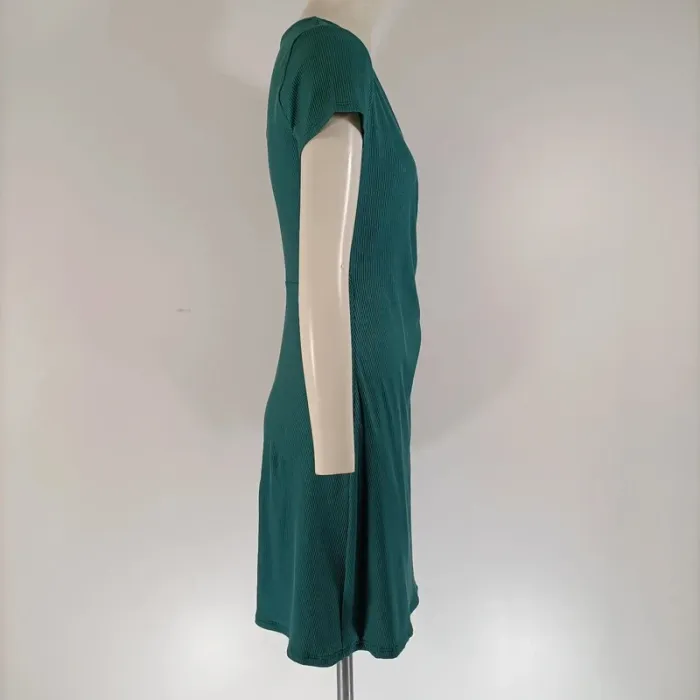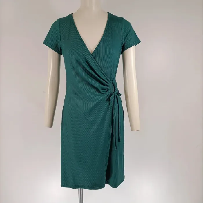 ⚠️ LIRE ATTENTIVEMENT LA DESCRIPTION ⚠️ 🚀 Envoi rapide 💎 État 10/10 Robe courte cache-cœur en maille côtelée vert foncé. Taille S. Coupe portefeuille avec lien à nouer sur le côté, matière fluide et extensible très confortable. Col en V, manches courtes, parfaite pour le quotidien ou une tenue chic décontractée.