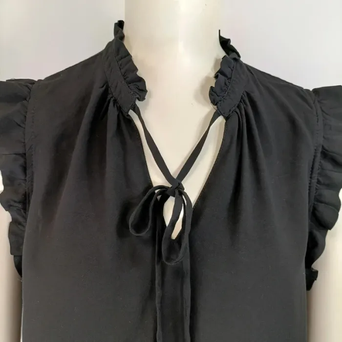 ⚠️ LIRE ATTENTIVEMENT LA DESCRIPTION ⚠️ 🚀 Envoi rapide 💎 État 10/10 - Comme neuf Top noir, sans manches, orné de jolis volants froncés au niveau des épaules. Col en V avec cordons noirs à nouer pour un détail élégant et féminin. Tissu fluide et agréable à porter, parfait pour le printemps ou l’été. 100% viscose