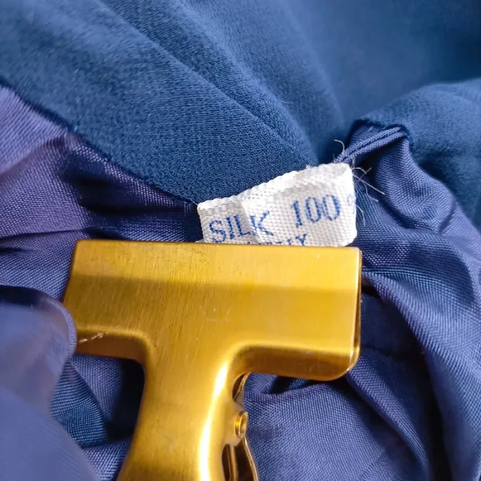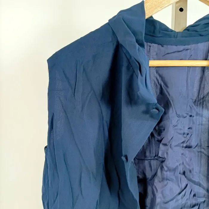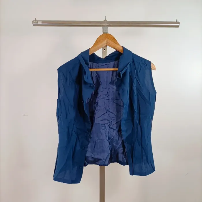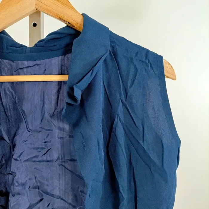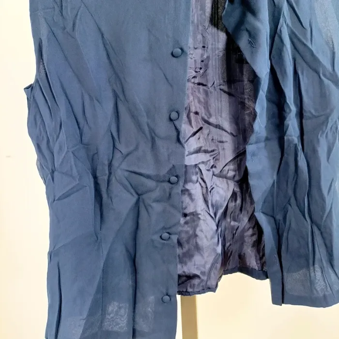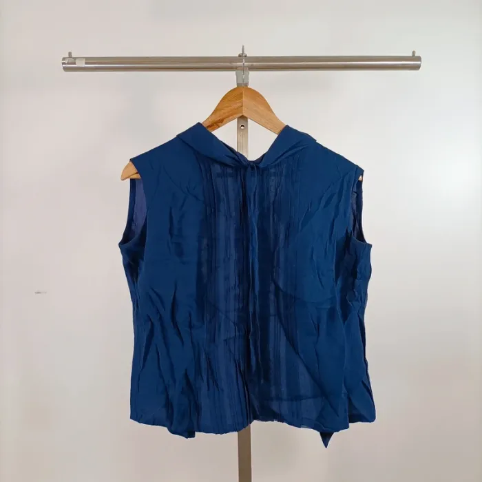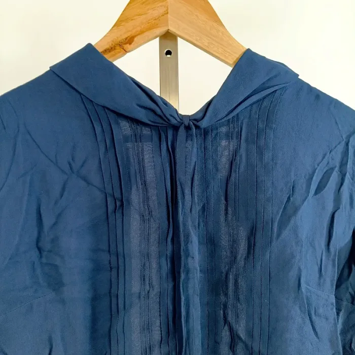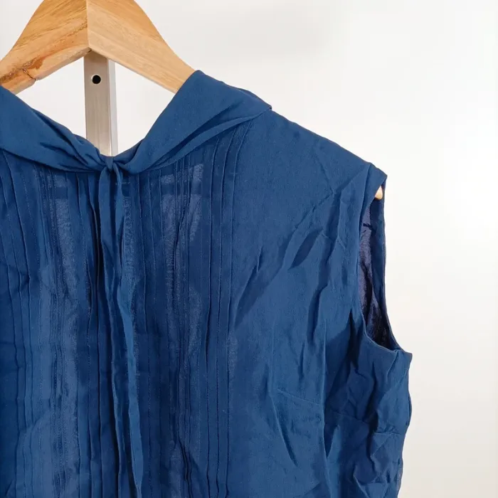 haut soie bleu marine, top soie sans manches, blouse made in Italy, haut col montant plissé, haut chic femme taille 46, chemisier fluide bleu foncé, haut élégant été