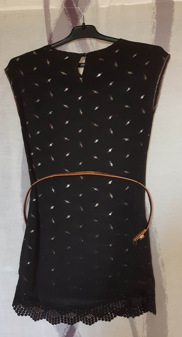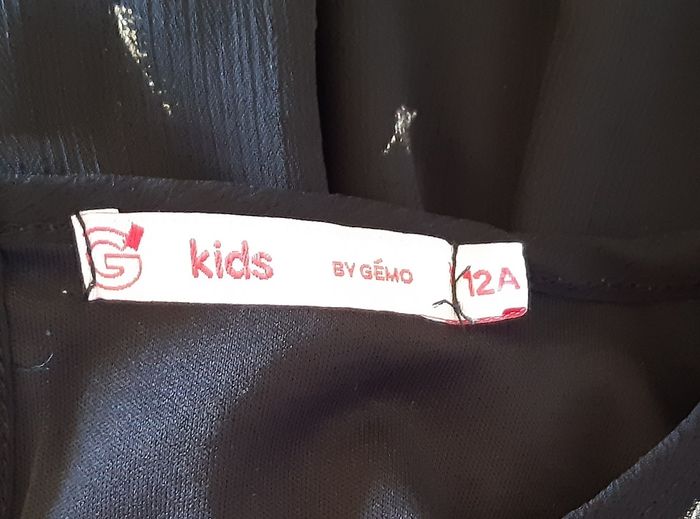 Robe fille Taille 12 ans Gemo Noir avec des plumes dorées Un petit peu de fils tirés (voir photo) Ceinture incluse mais je ne sais pas si c'est la bonne qui était vendue avec elle, des paillettes manquantes Très bon état