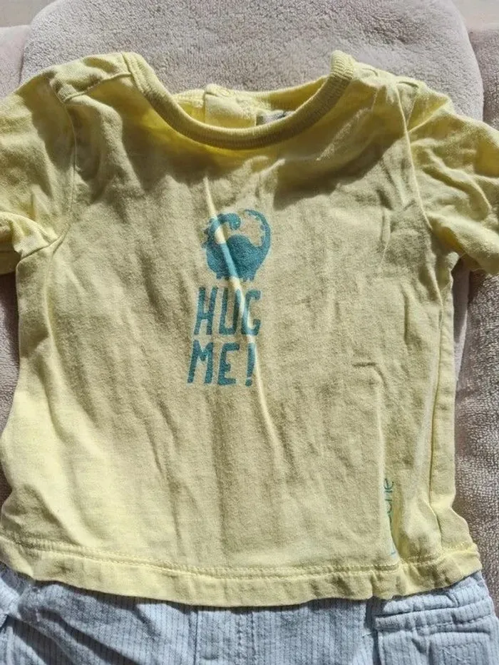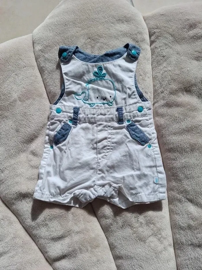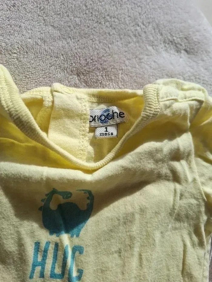 Lot de 3 barboteuses taille 1 mois en très bon état - la première rayé marin avec le crabe de la marque obaidi en 100% coton - la seconde jaune de la marque brioche - la troisième blanche de la marque obaidi #auree36_Etaille1mois