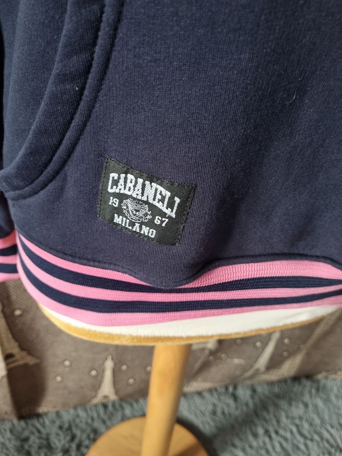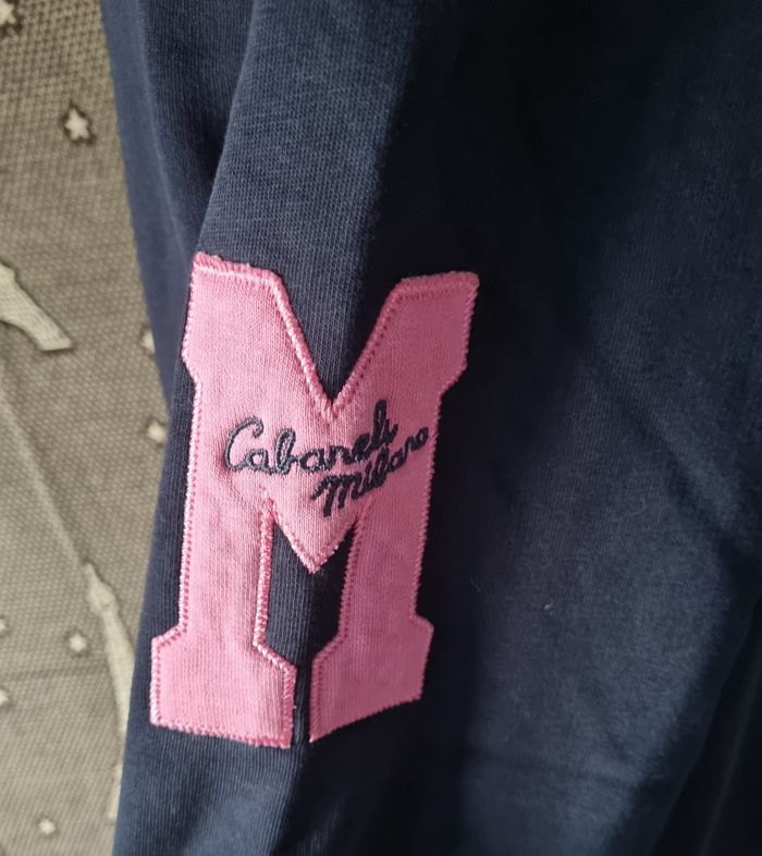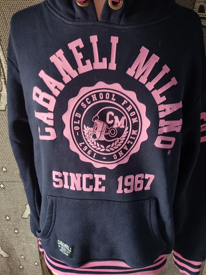 Sweat à capuche marine avec écriture rose,taille M marque Cabaneli Milano,poche ventrale, longueur 63cm, largeur 51cm, longueur épaule à aisselle 24cm, largeur aisselle à aisselle 54cm,longueur manche 56cm.
