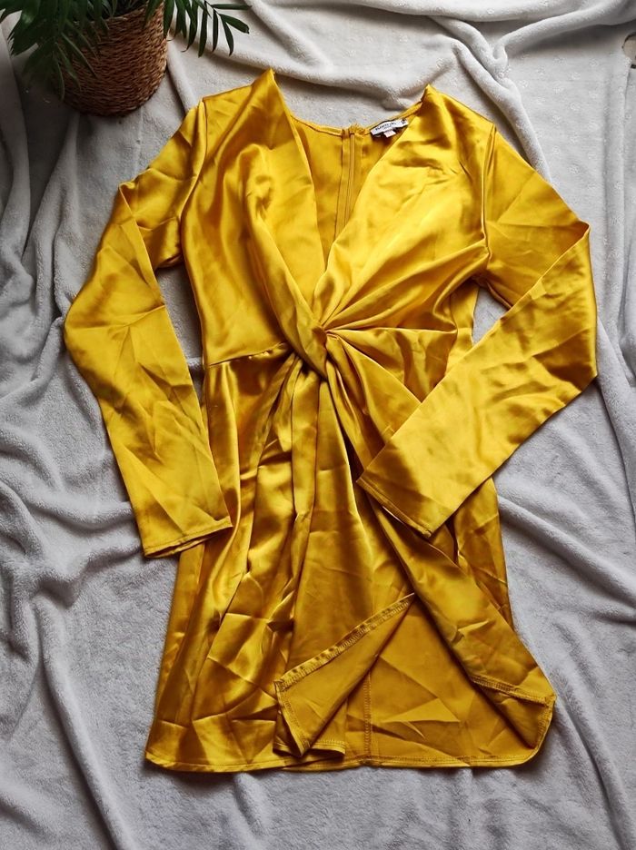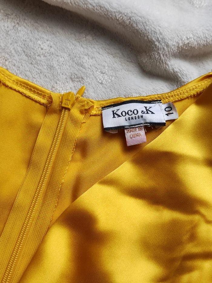 magnifique robe jaune et soyeuse. À manches longues , grand décolleté en v, bas échancré à l'avant. Fermeture éclair dans le dos Marque koco & k étiqueté 10 se qui correspond a un 38. Porter pour une occasion, ni trou tâches ou déchirures, en parfait état.