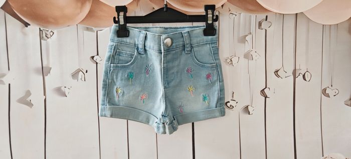 👶 Taille 3-6 mois – Marque Primark 🌸 Short bleu clair avec jolies broderies florales multicolores 🎀 Coupe confortable avec revers cousus 📌 Bouton décoratif à l’avant – passants pour ceinture ☀️ Parfait pour les journées estivales – excellent état #Eté_Fille3_6mois(62cm)💕