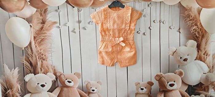 👶 Taille 3 mois – 62 cm – Marque Cuddles&Smiles 🍑 Combinaison couleur pêche, douce et légère 🎀 Détail volanté + joli nœud à la taille ✨ Tissu ajouré broderie anglaise – fermeture zippée au dos + pressions à l’entrejambe 🌼 Idéal pour les beaux jours – état impeccable ! #Eté_Fille3_6mois(62cm)💕