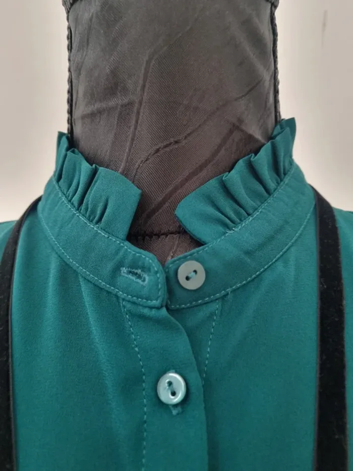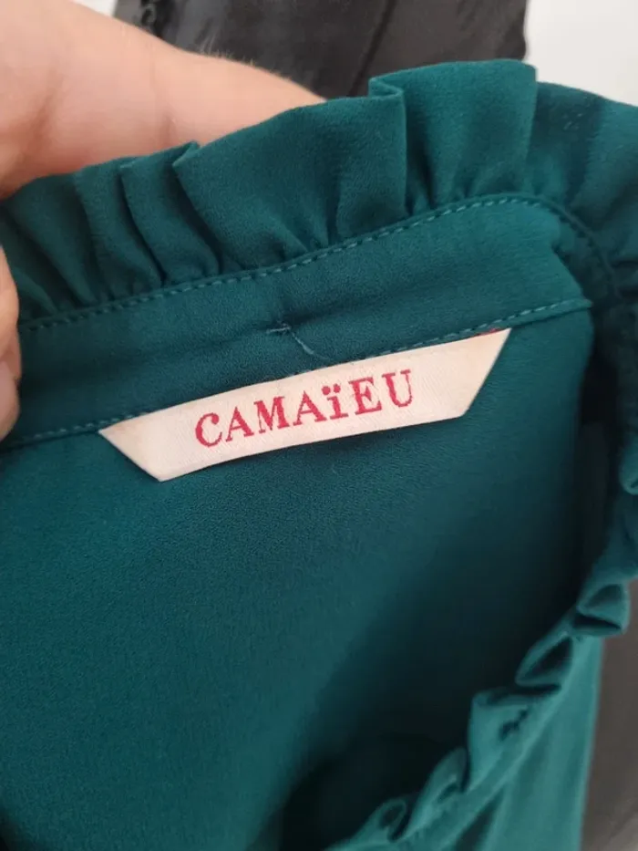 Peu portée, en parfait état 👍 Taille M, Camaïeu Couleur vert canard Une lanière en velours boutonnée au col pour un style plus travaillé 😍 Matière fluide infroissable Envoi rapide et soigné ⏳️