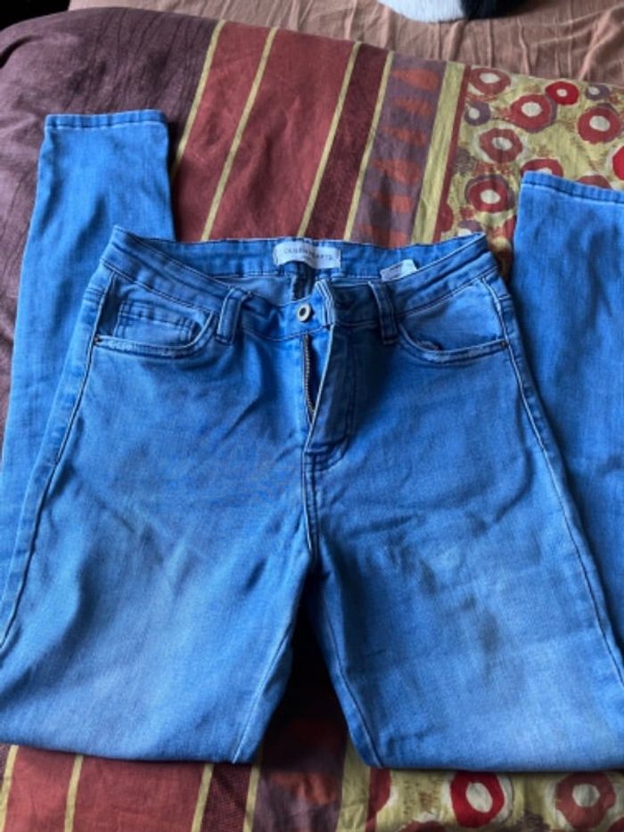 Fausse fermeture éclair sur l’arrière qui donne un côté extravagant et créatif à ce jean Queen Hearts 😀 La boucle de la fermeture éclair est cassée (voir photo) mais n’empêche pas son fonctionnement. Les bas des jambes sont légèrement usés (je ne sais plus si c’était fait exprès 🤔) Taille 38/M