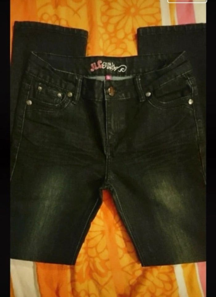 jean noir droit, délavé devant, paillettes sur les poches, taille 16 ans, état proche du neuf Pourra convenir à un XS