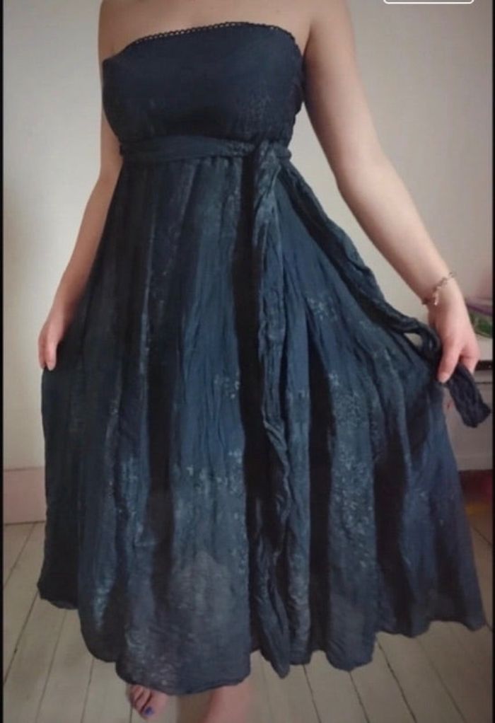 Magnifique robe bleue en soie Peut aussi se porter en jupe longue ceinture sur le côté en excellent état Pas de taille mais correspond à un 36/38