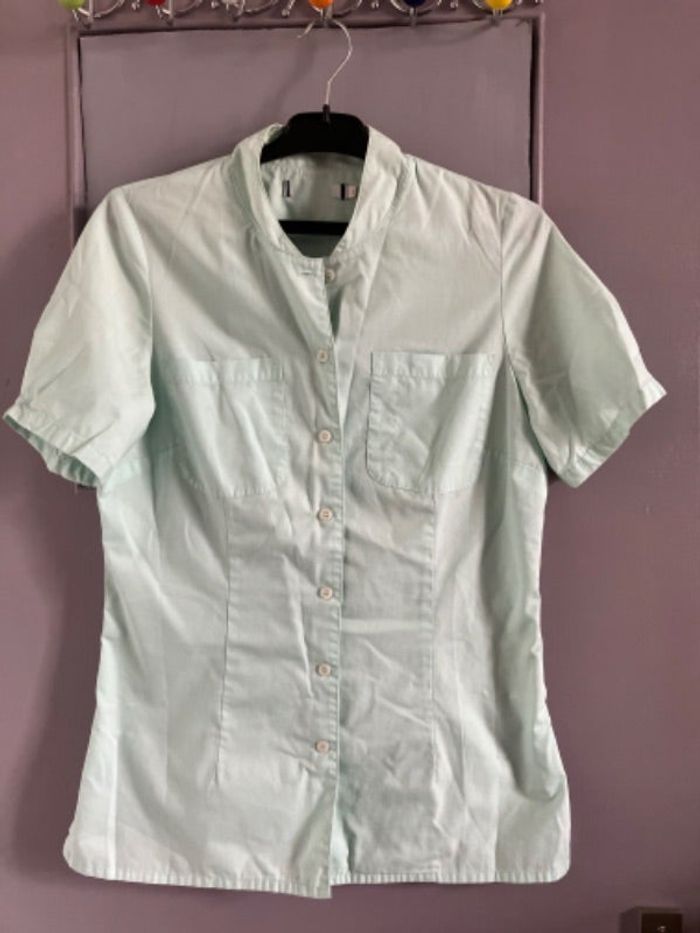 En bon état car présente quelques traces au col. En dehors de ça elle est nickel. Très joli vert très pâle plutôt vert d’eau. Col Mao taille 2