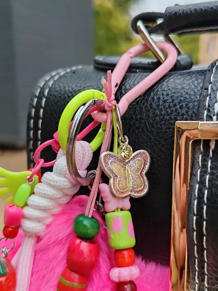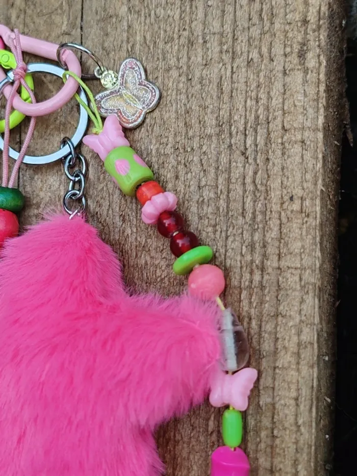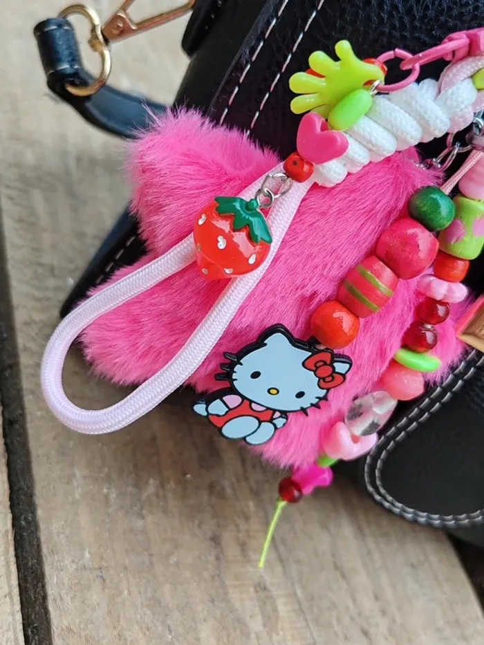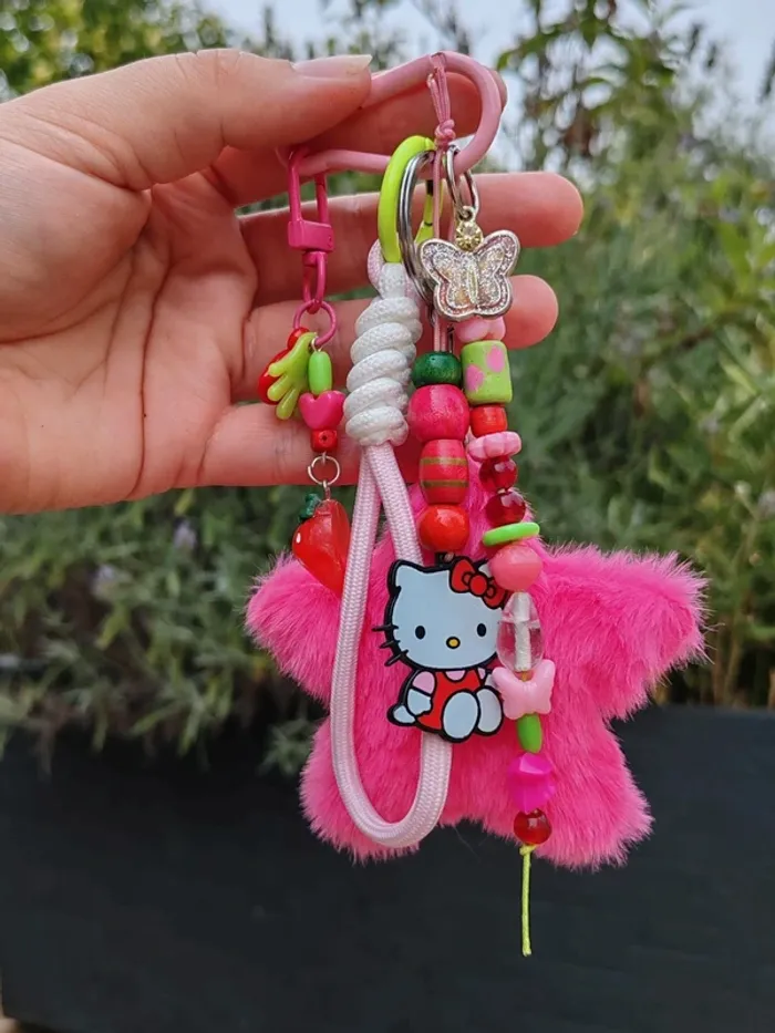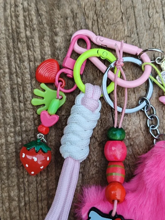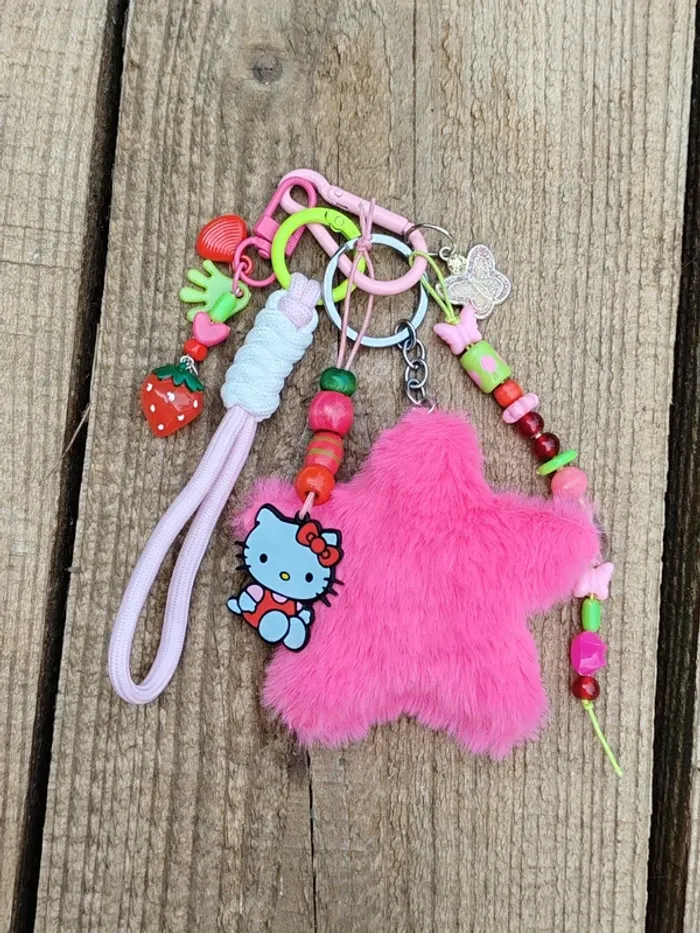 Ce porte-clé est un modèle unique, il n'existe qu'en un seul exemplaire ! Matériaux utilisés : - un mousqueton en métal rose - des perles diverses en bois, plastique, verre et métal - un pendentif hello kitty en plastique - un pendentif pompon en forme d'étoile rose - de la corde paracord - un pendentif papillon en métal argenté - un pendentif fraise en résine rouge Dans des tons rose / vert / rouge #ursullabuffaybijoux #ursullabuffaybijouxdesac #ursullabuffayhellokitty
