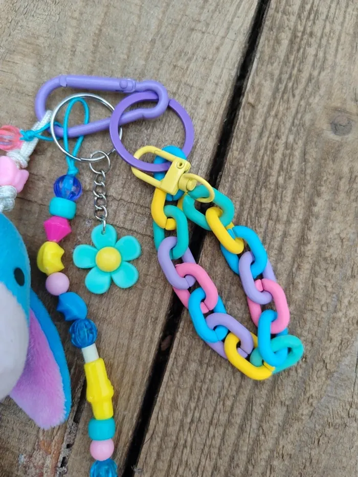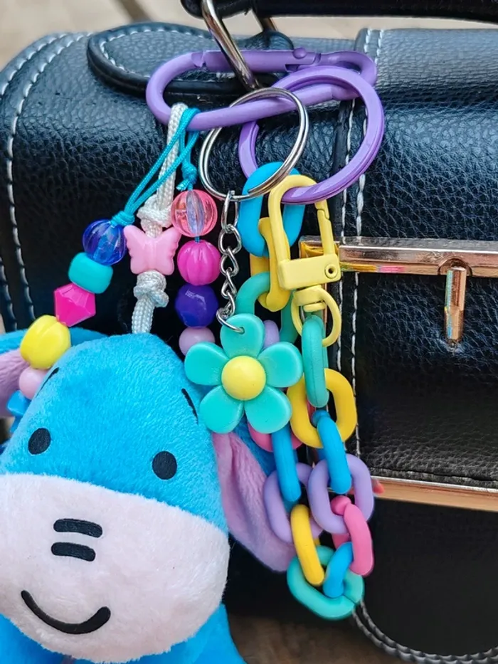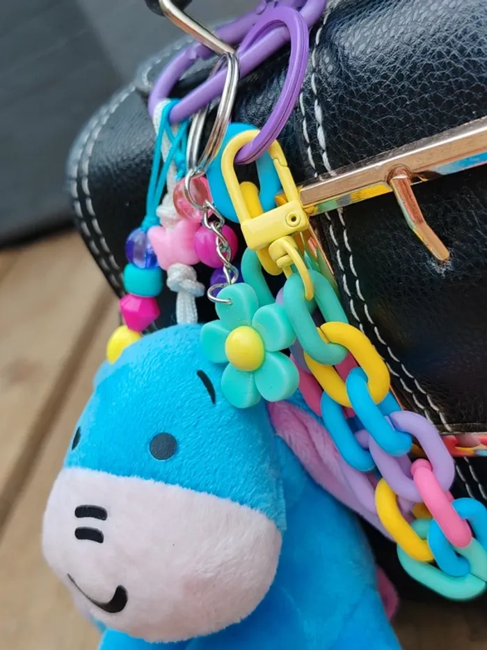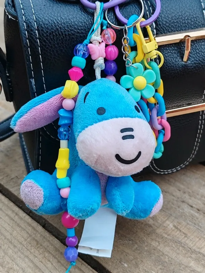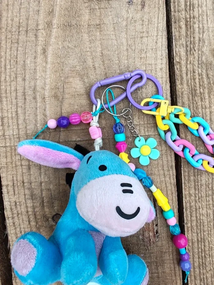 Ce porte-clé est un modèle unique, il n'existe qu'en un seul exemplaire ! Matériaux utilisés : - un mousqueton en métal violet - des perles diverses en bois, plastique, verre et métal - un pendentif peluche bourriquet Winnie l'ourson (cuties Disney) - une chaîne en plastique multicolore - un pendentif fleur en plastique vert d'eau Dans des tons bleu / vert / violet / jaune / rose #ursullabuffaybijoux #ursullabuffaybijouxdesac #ursullabuffaydisney