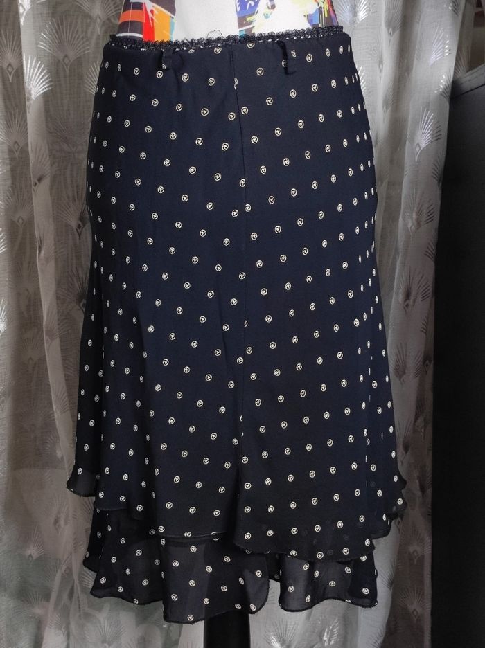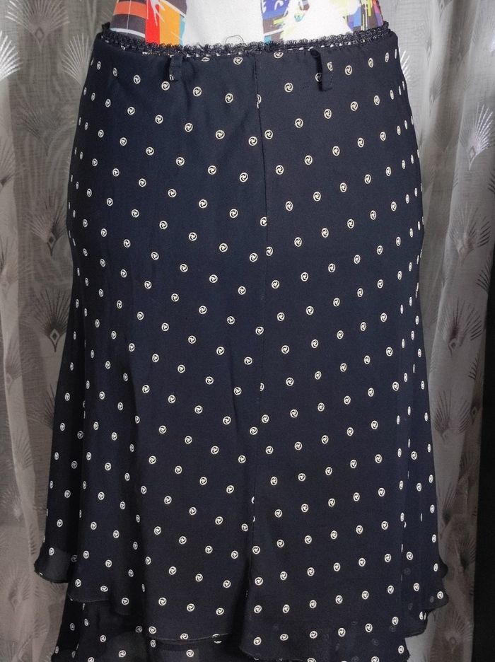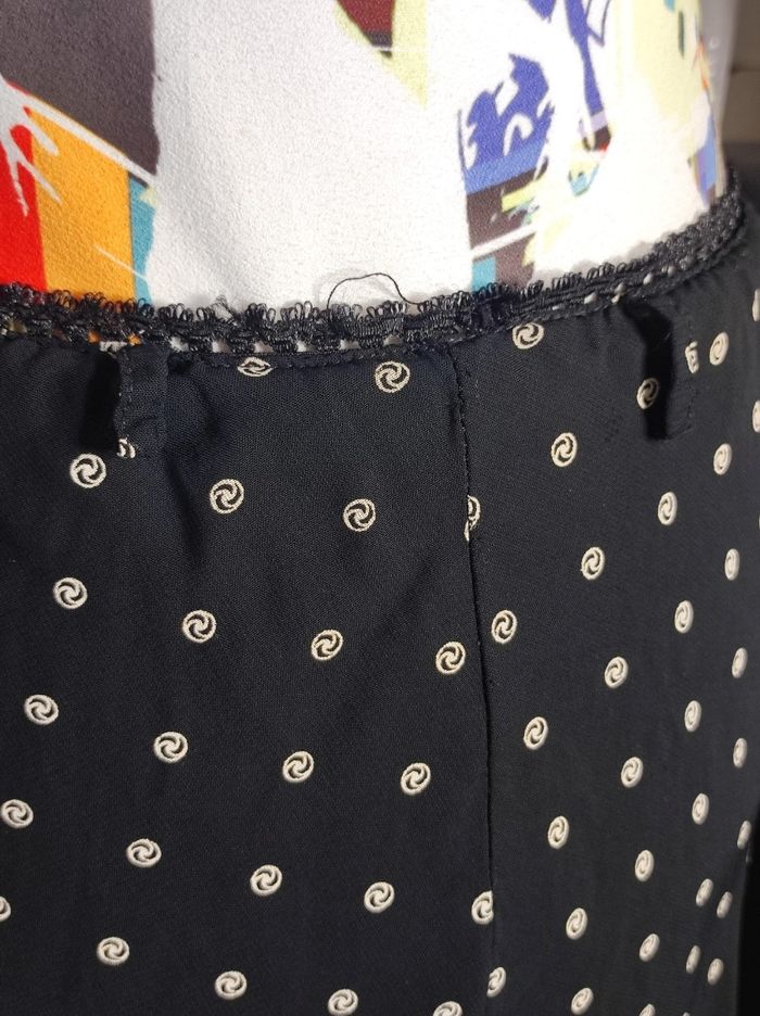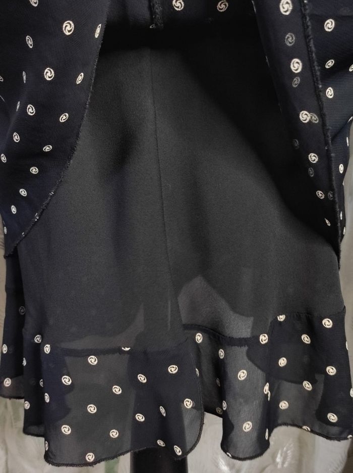 Jupe vintage des années 80, sans marque de taille T2 se qui correspond a un 36, élastique au niveau de la taille, on peut même y glisser une ceinture. jupe à double volant, noire à petit motif cercle. Composition de viscose & polyester. En parfait état.