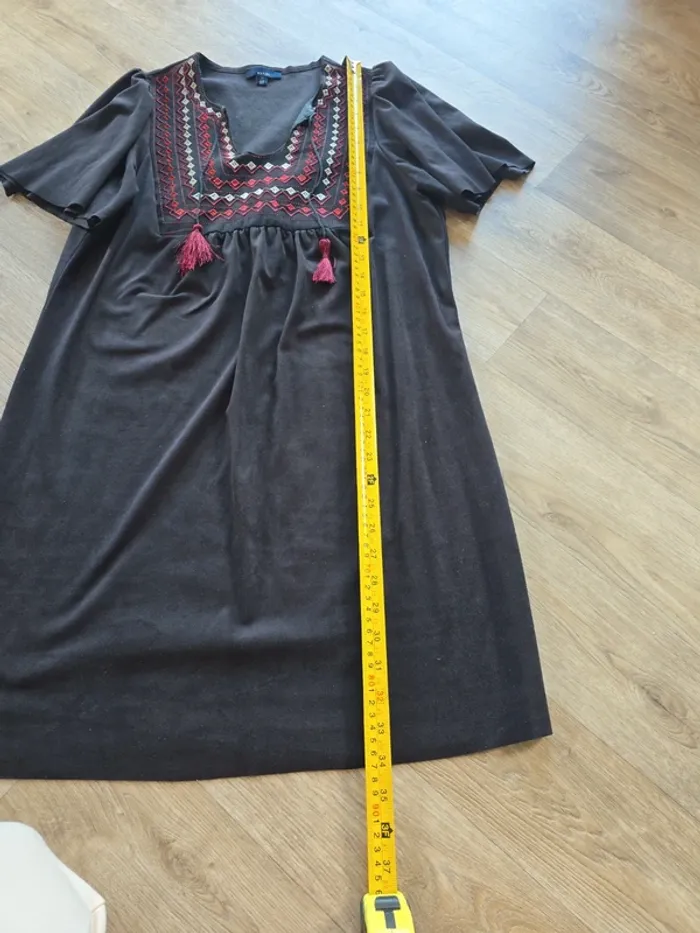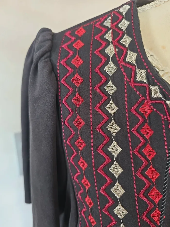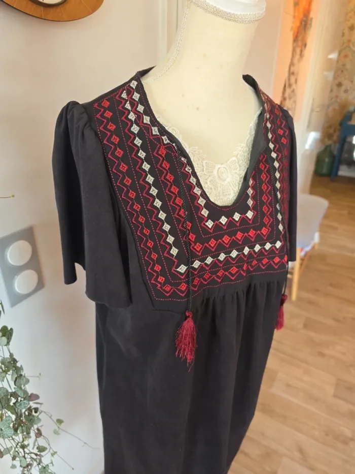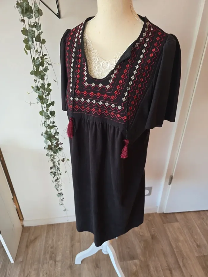 Robe de couleur noire, broderie dans les tons rouge bordeaux et beige, et deux jolis pompons. #robefemme #robefemme40 #robefemmekiabi