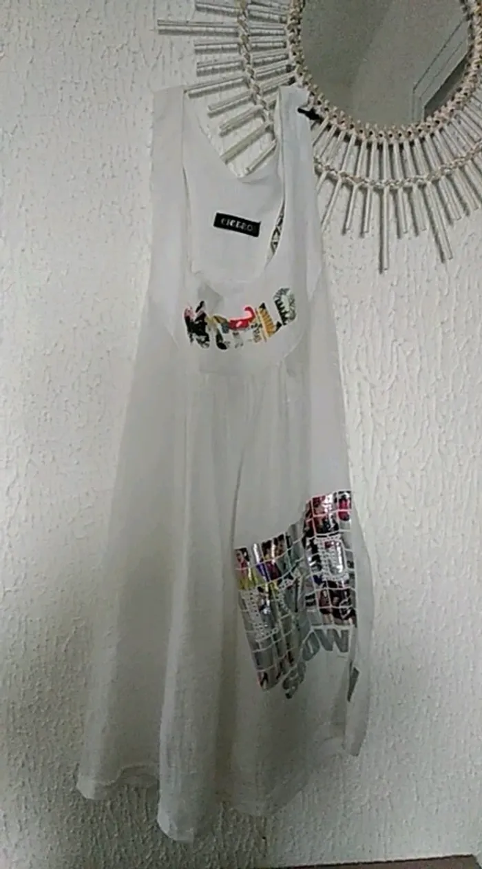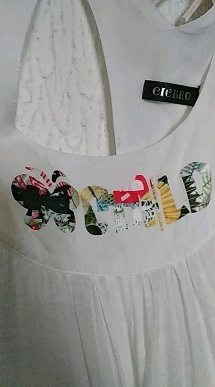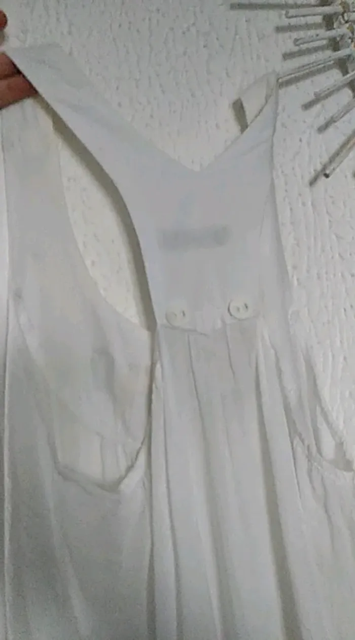 Tunique blanche sans manches pour l'été. De couleur blanche assez transparent voir la photo. Motif et strass. Bon état général voir sur les Bretelles la couleur est un peu passé d'où le prix bas. Taille unique correspond à un 38
