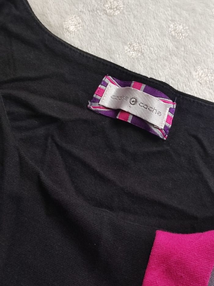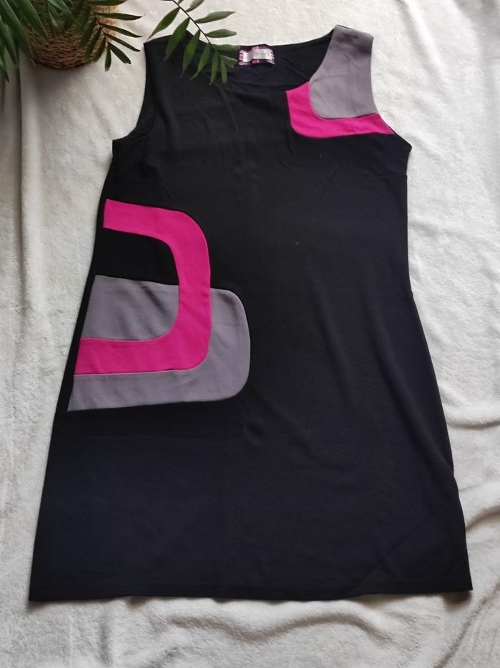 Robe courte sans manches au style sixtine londonien Couleur des motifs fushia / gris sur fond noire. Matière 66% viscose, 30% polyester et 4% elasthanne. Marque cache cache taille 42. En parfait état, porter pour une occasion.
