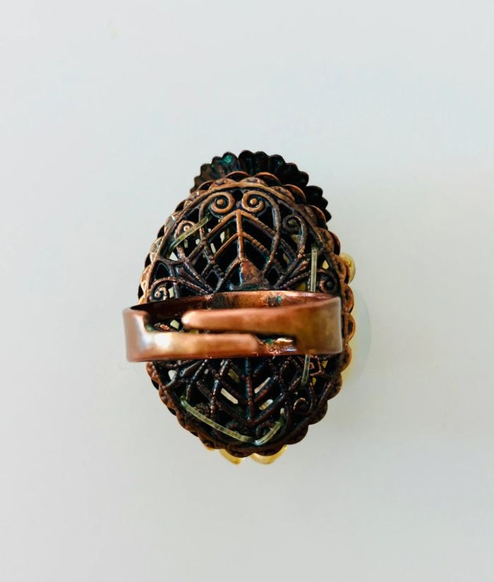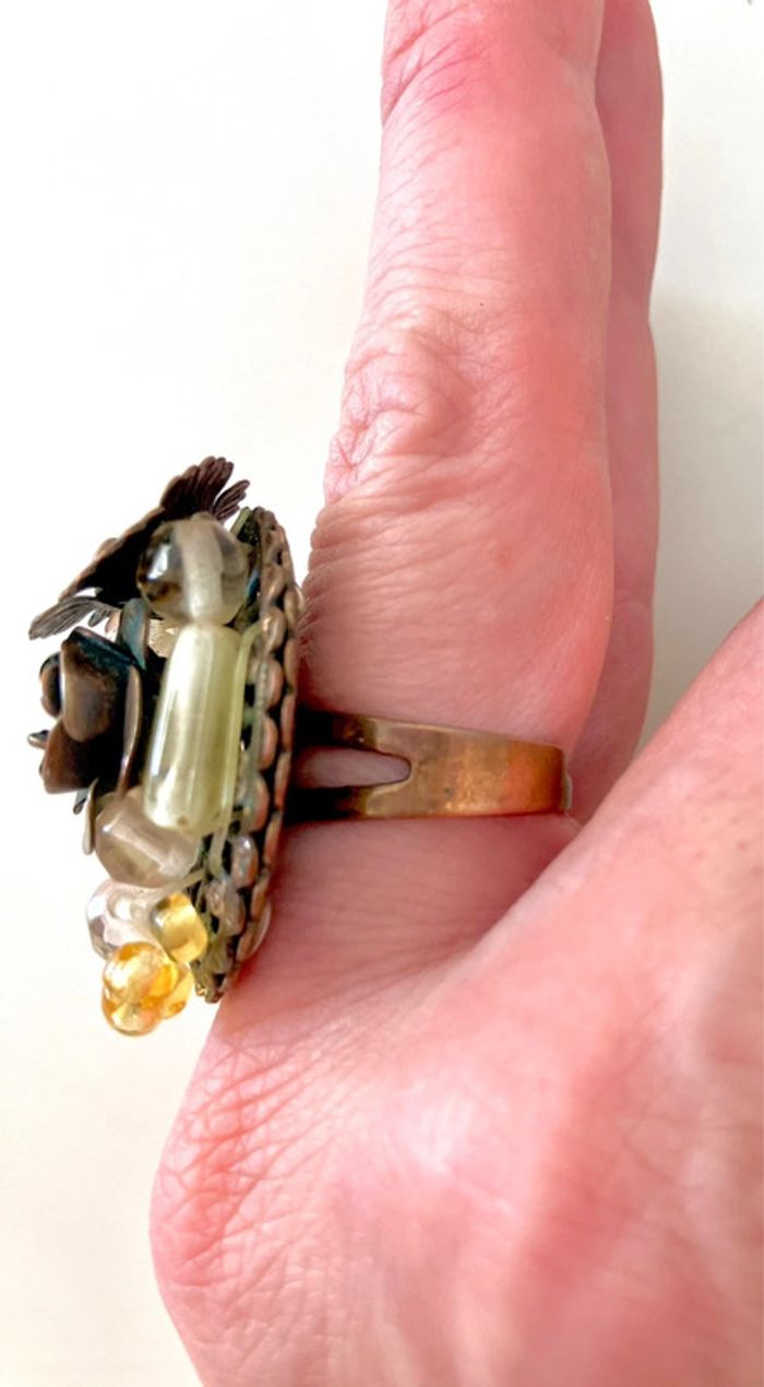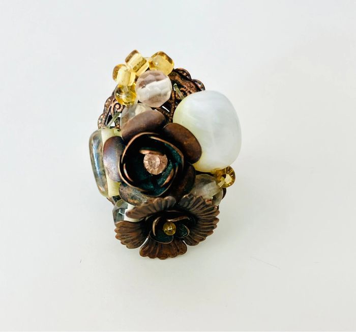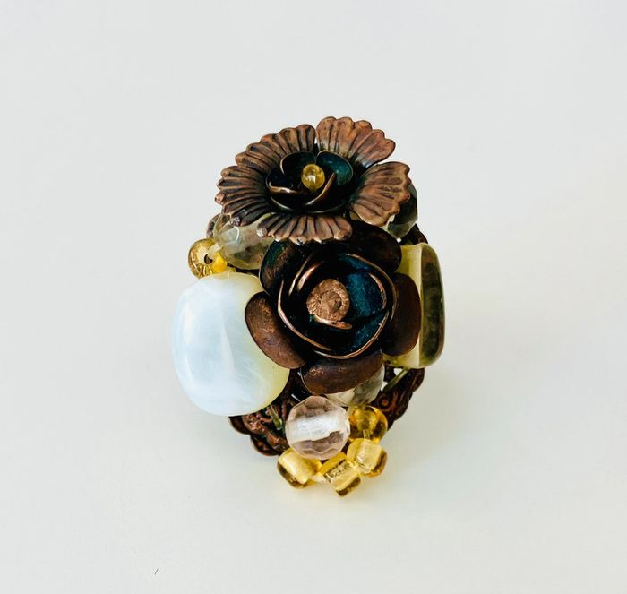 Bague ajustable style baroque avec fleurs, pierres et perles Bague travaillée devant mais également au dos En très bon état