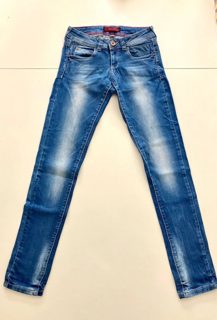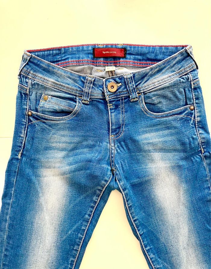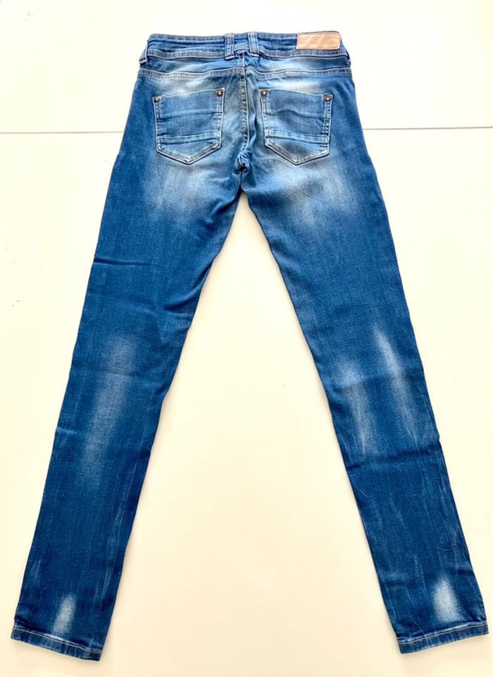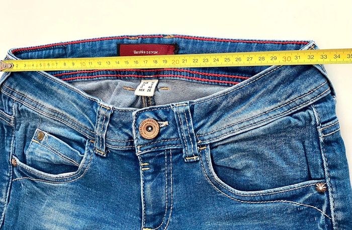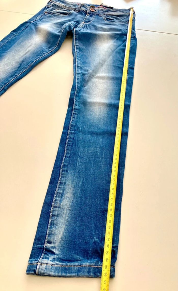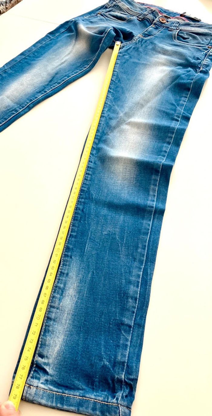 Jeans bleu de la marque Bershka en taille indiquée 36 Se ferme devant par une fermeture éclair, deux poches et 1 pochette devant, et deux poches au dos Pas d’étiquette sur la composition Lavable en machine - Envoyé lavé et repassé Dimensions : longueur : 96.5cm + entrejambes : 79 cm + taille non étirée : 32.5 cm