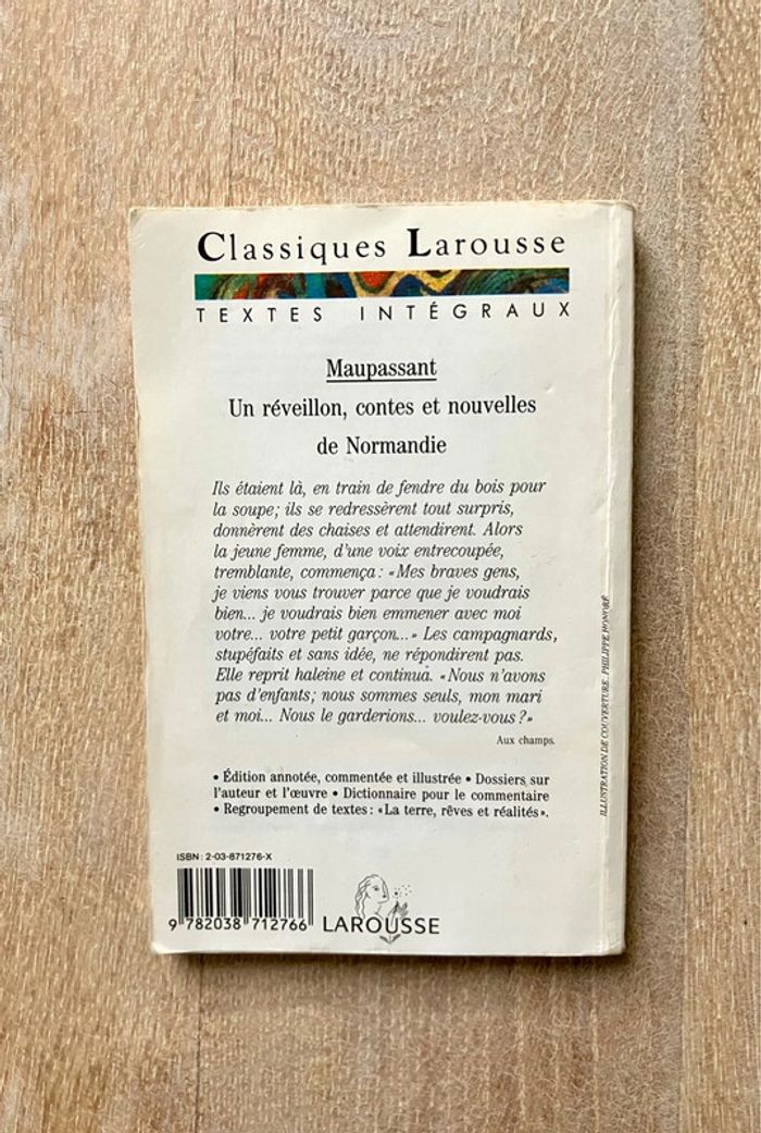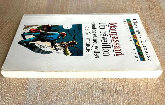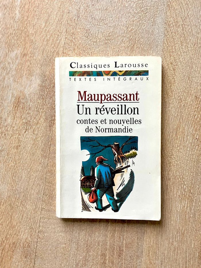 Un réveillon et autres contes de Normandie de Guy de Maupassant Editeur : Larousse Collection : Classiques en très bon état, une tranche du livre est un légèrement jaunie Maupassant nous convie ici sur ses terres de prédilection, en Haute-Normandie, au pays de Caux. Avec le souci impressionniste du détail, il nous fait partager sa familiarité des scènes de la vie paysanne et des mentalités rurales, brossant un tableau au quotidien du petit peuple rongé par l’avarice, l’appât du gain et l’alcoolisme. Au final : dix-huit contes sans concession, entre rire et satire, où les personnages semblent surgir d’un monde irréel et ne rien connaître de la bonté.