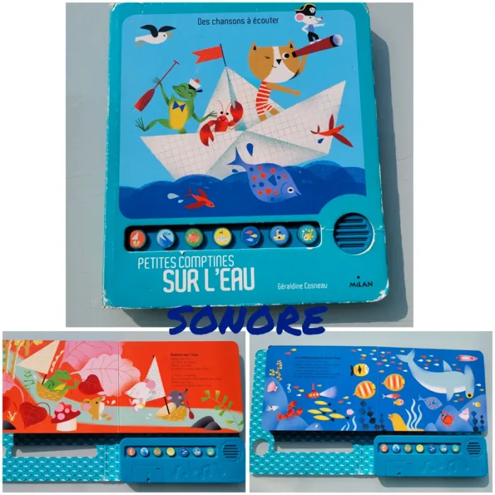DES CHANSONS À ÉCOUTER PETITES COMPTINES SUR L'EAU Grâce à son boîtier sonore fixé sur l'ouvrage et à ses 7 puces d'une durée de 20 secondes chacune, la lecture de l'illustration et l'écoute des chansons sont simultanées. Avec ce livre, les enfants redécouvriront avec plaisir les célèbres comptines marines telles que "Bateau sur l'eau", "C'est la baleine", "Mon poisson rouge", "Il était un petit navire", "Les Petits Poissons dans l'eau", "Maman, les p'tits bateaux", "Un poisson au fond d'un étang". Couvertures intérieure et extérieure abîmées, les 7 puces fonctionnent, bon état général Mes autres livres sonores : #livresonoremooglou Mes autres livres enfants : #livreenfantmooglou