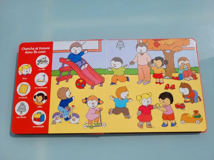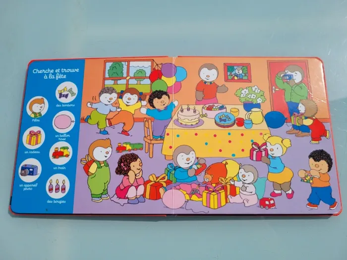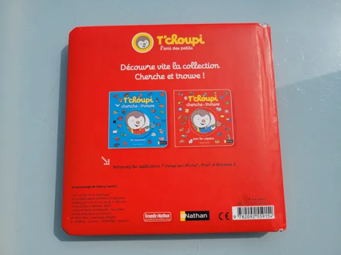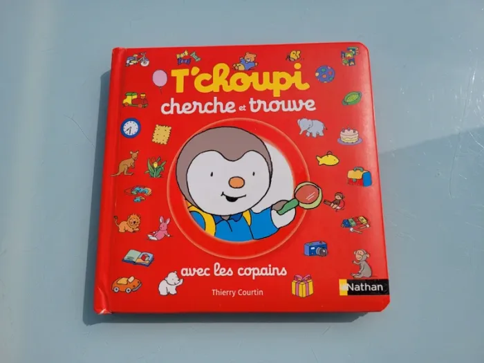 T'CHOUPI CHERCHE ET TROUVE AVEC LES COPAINS Viens aider T'choupi et ses copains à retrouver des objets ! Cherche et trouve les objets du quotidien avec T'choupi et ses copains ! 6 grands décors avec 7 objets à retrouver ! Dès 2 ans. Coins abîmés sinon en très bon état