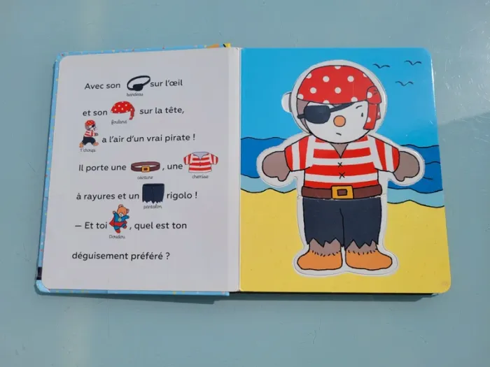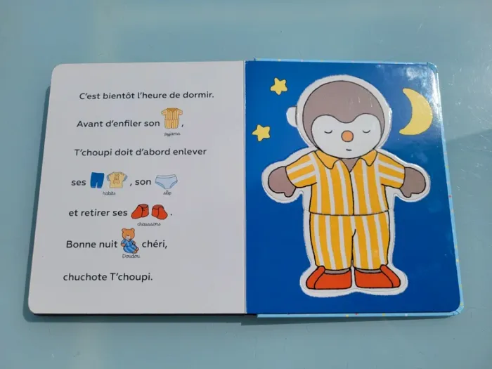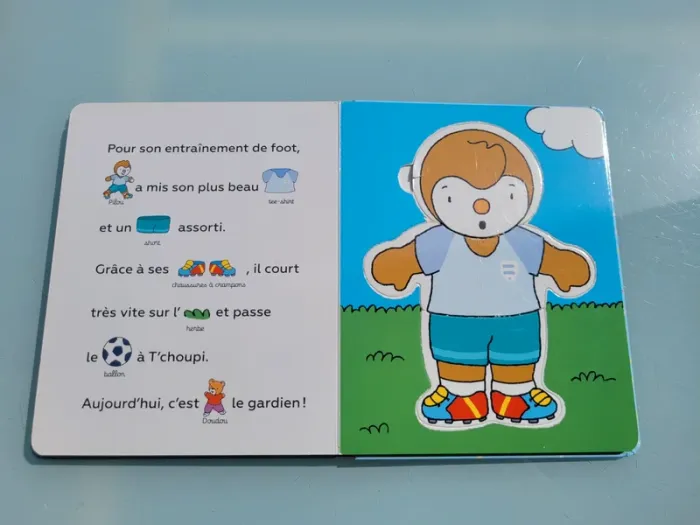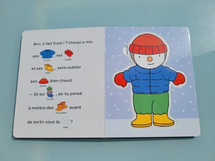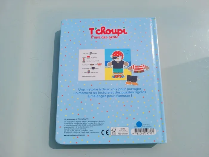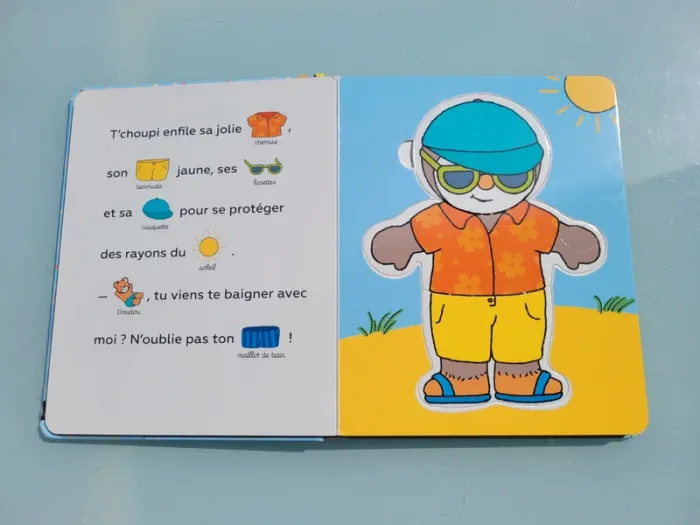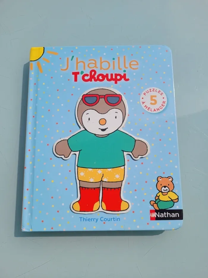 J'HABILLE T'CHOUPI LIVRE 5 PUZZLES DE 2 PIÈCES Apprendre à s’habiller, c’est facile avec T’choupi ! Un maillot de bain pour la plage, un pull bien chaud pour l’hiver, et un pyjama tout doux pour le coucher… Le parent lit l’histoire pendant que l’enfant devine les mots grâce aux vignettes. Puis,il mélange les pièces pour créer des assortiments rigolos ! C'est aussi une histoire à lire à 2 voix pour développer son vocabulaire. Avec 5 puzzles de 3 pièces à mélanger (tête, buste, jambes) Contours des pièces montrant pour certaines une très légère usure, sinon en très bon état Mes autres livres puzzle : #livrepuzzlemooglou Mes autres T'choupi : #tchoupimooglou Mes autres livres enfants : #livreenfantmooglou