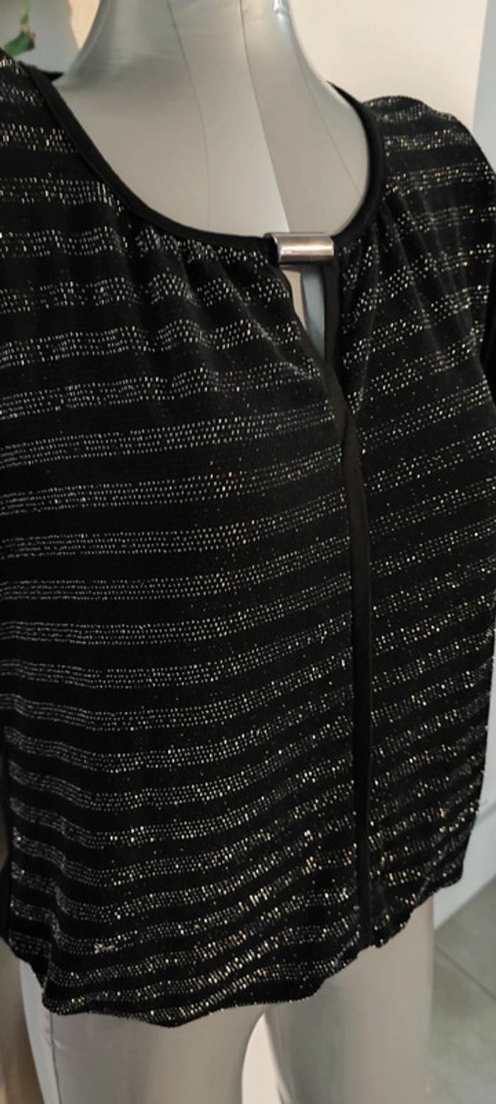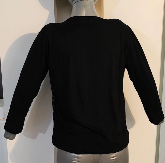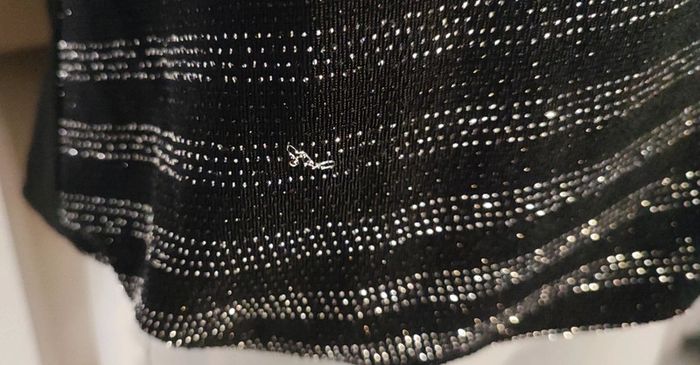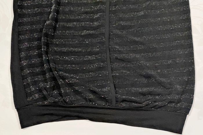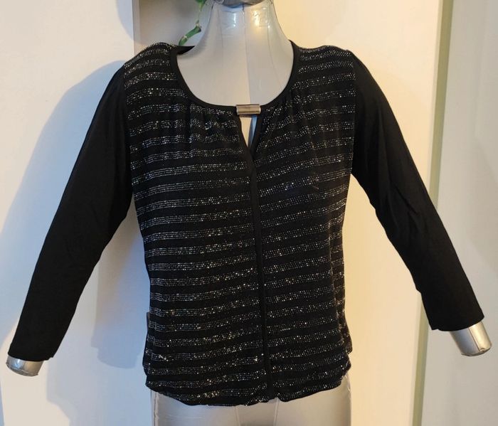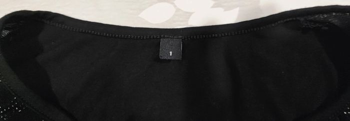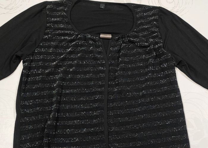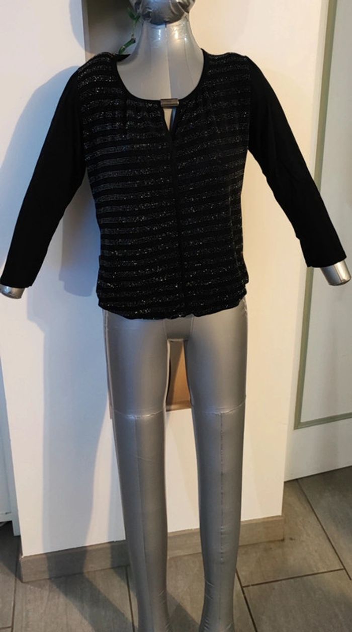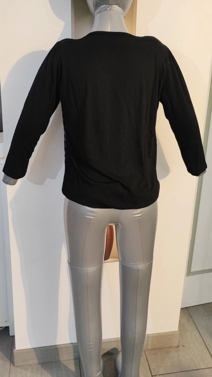 Haut manches longues Brillant sur le devant Noir Taille 1 bon état Petit accroc en bas voir photo. Taille du mannequin 165cm