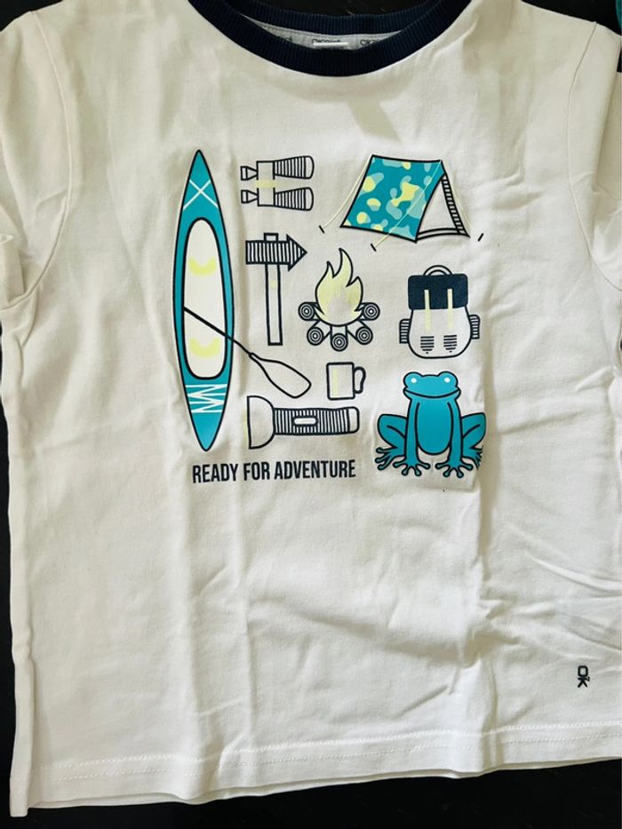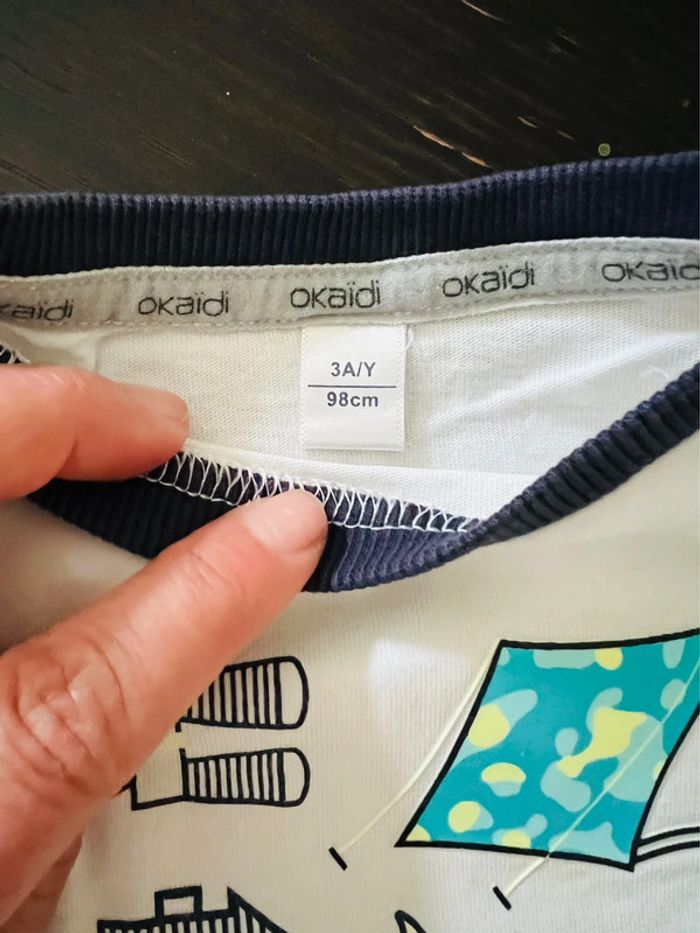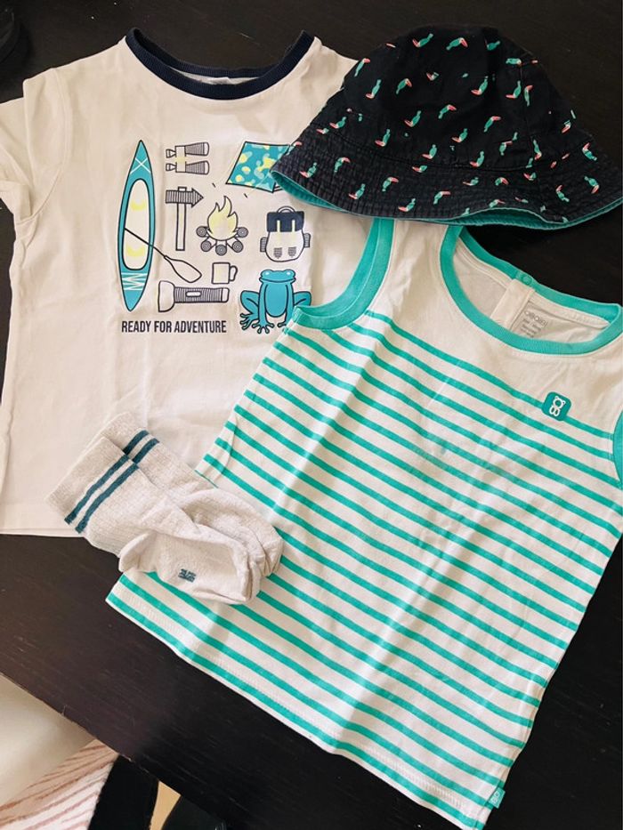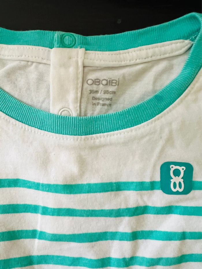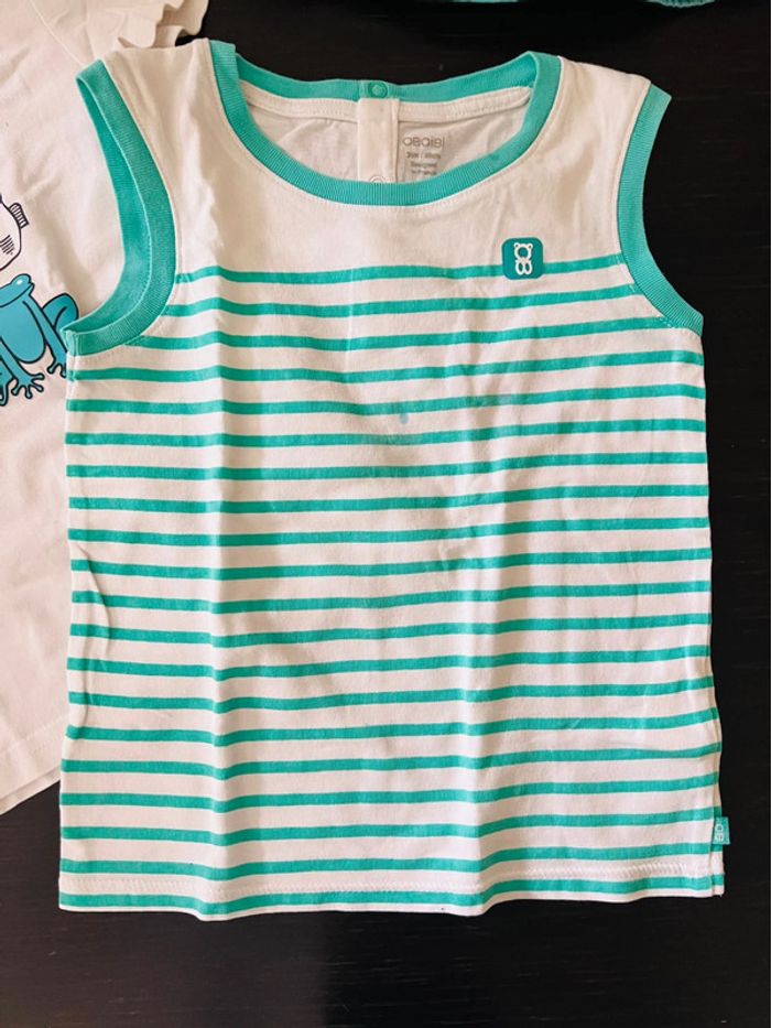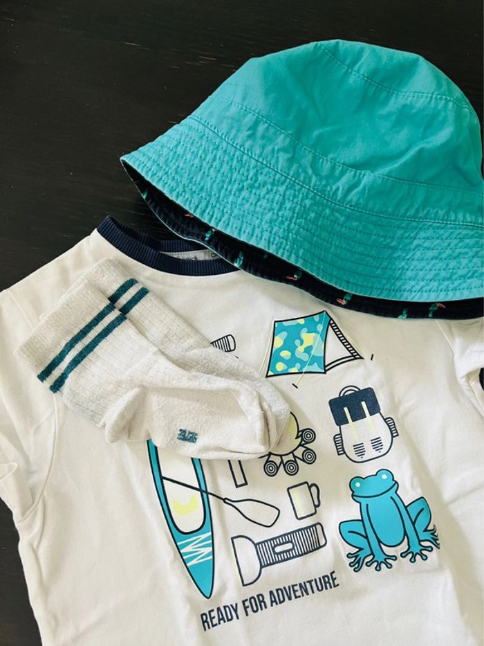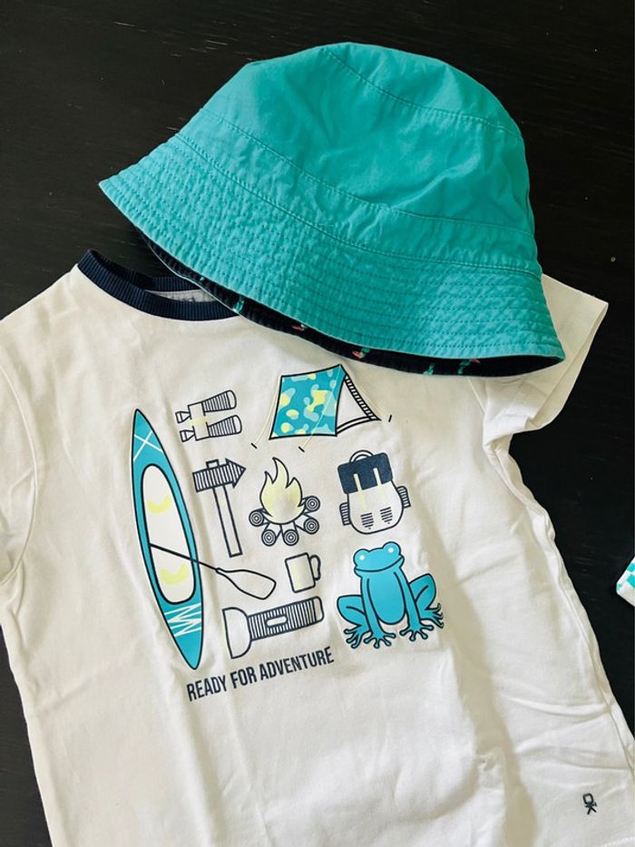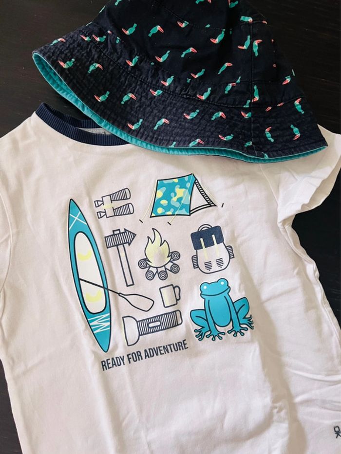 Lot très sympa pour passer un été avec succès ! Composé: - d’un débardeur okaidi rayé en très bon état - le coton est impeccable ( mais petite tache au niveau de la 5eme rayure en partant du haut ) - d’un tee shirt manche courte okaidi fluorescent dans la nuit pour le parfait c’petit campeur ( cf motif 😍) - très bon état ( micro tache dans le dos. 1 peine visible mais je préfère le spécifier - un bob réversible en coton ( très sympa) en très bon état - j’ai rajouté une paire de chaussette avec rayure Avec moi aucune surprise tout est bien détaillé. Je prends soin de l’entretien des vêtements de mon fils. Et pour avoir eu des expériences malheureuses sur Vinted… cela compte aussi 🤓 Regardez mes annonces pour garçon - j’ai beaucoup de propositions dans mon dressing