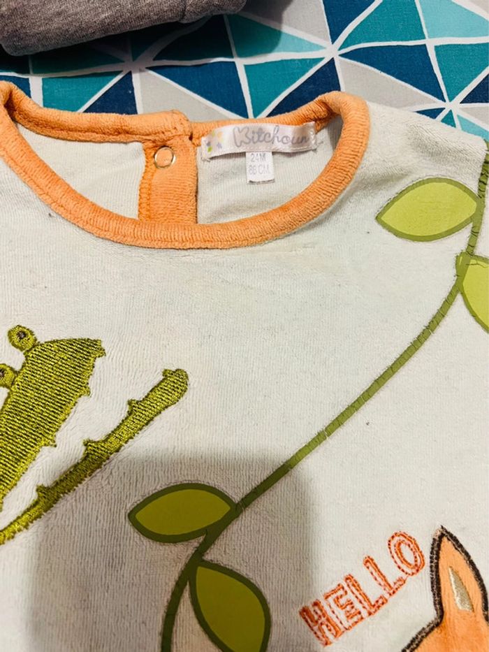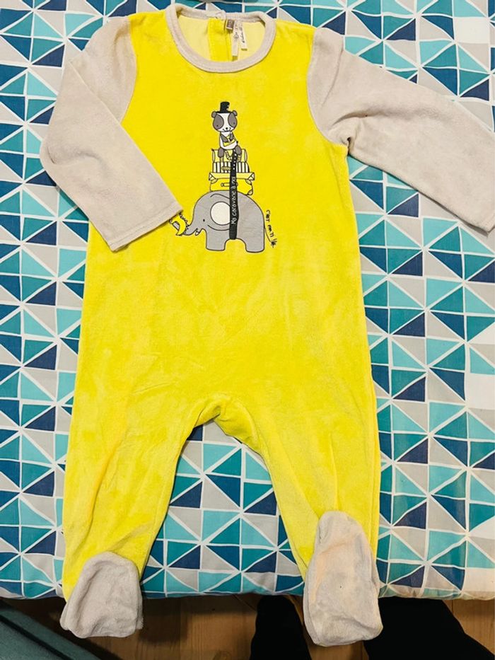 3 Pyjamas 1 pièce avec pieds - le bleu est en excellent état ( Gemo) - le jaune est en très bon état ( orchestra) - le vert avec motifs jungle est en bon état ( le velours est un peu passé et il y a une tache légère sur l’arrière gauche - c’est photo). Toutes les pressions fonctionnent parfaitement Regardez mon dressing - je viens de mettre de nombreux vêtements en ligne 😊