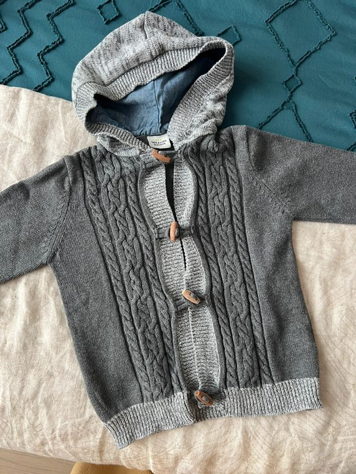 Gilet en très bon état avec boutons en bois et capuche doublée. Gilet épais