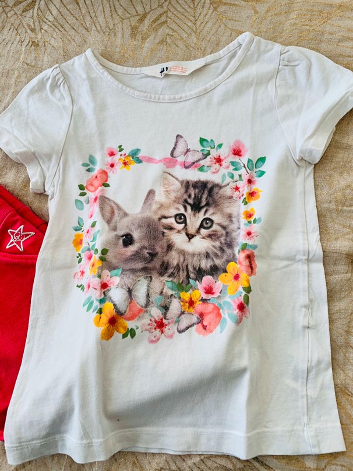 Idéal pour la saison - je vends cet ensemble casual composé d’un jogging pantacourt de chez Orchestra - en très bon état + un ts chat très mignon en Tbon État de H&M + un ts Gemo vert avec un chien ( le visuel du chien est un peu abîmé - cf photo mais c’est leger- bon état) n’hésitez pas à jeter un coup d’œil à mon dressing je propose de nombreux ensembles😊 bénéficier de réductions et économisez sur les frais de port 😉