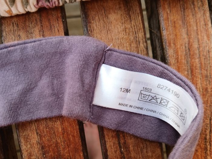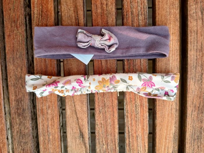 2 bandeaux pour les cheveux - 1 rose / violet avec un petit noeud fleuri. Taille indiquée sur l'étiquette : 12 mois. - 1 a motifs fleuris. Très bon état