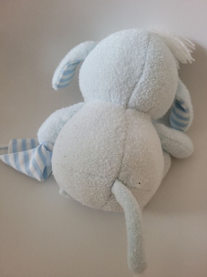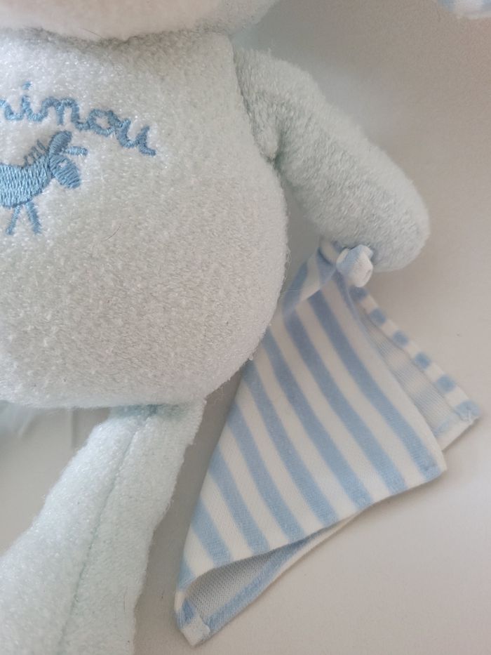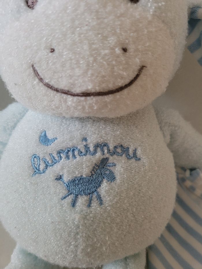 Peluche luminescente Le luminou s'illumine naturellement dans le noir en se chargeant en quelques secondes à la lumière (lampe, soleil, lumière du jour) et s'éteint progressivement avec le sommeil de l'enfant Sans pile et lavable en machine Hauteur 32 cm Très bon état