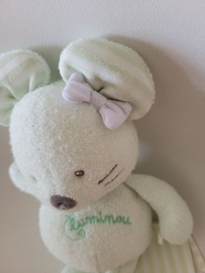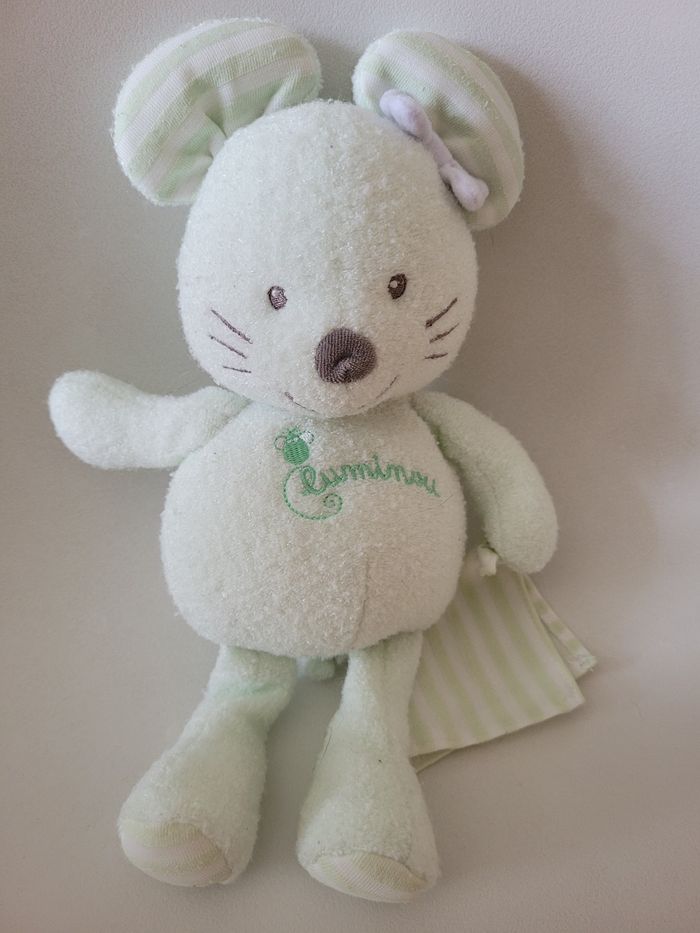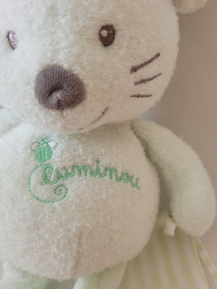 Peluche luminescente Le luminou s'illumine naturellement dans le noir en se chargeant en quelques secondes à la lumière (lampe, soleil, lumière du jour) et s'éteint progressivement avec le sommeil de l'enfant Sans pile et lavable en machine Hauteur 35 cm Très bon état