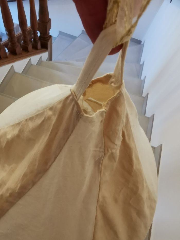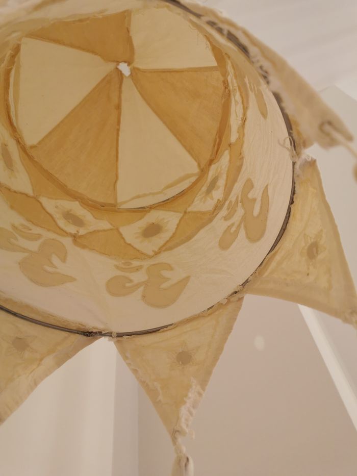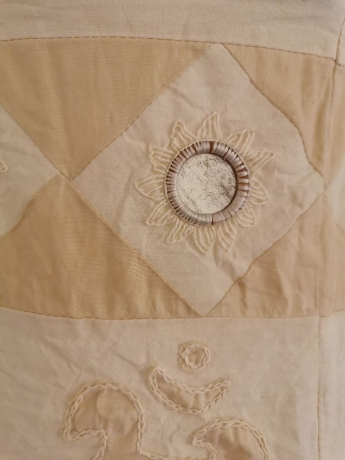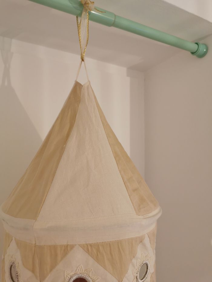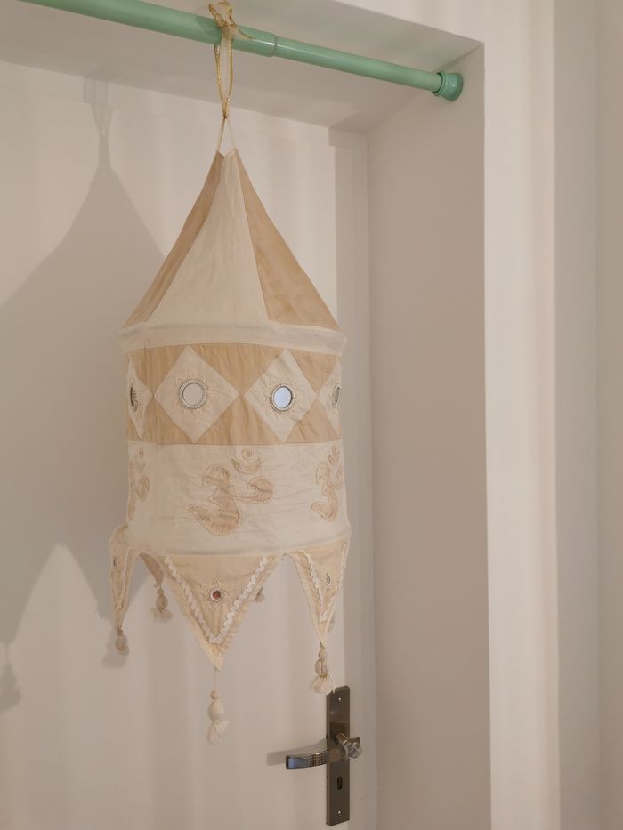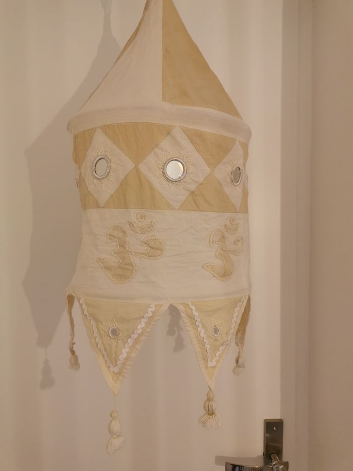 Suspension en coton blanc, écru, beige, jaune Partie centrale cylindrique avec patchwork de tissu écru, beige-jaune, déco broderie et miroirs. 6 pointes en triangle décorées prolongent le cylindre, terminées par petits pompons. Hauteur 60 cm + 4.5 cm pour le lien d'accroche. Diamètre 27 cm 100% coton Utilisé, reste en très bon état global. A noter quelques petites traces + 1 des miroirs un peu noirci. Présenté sur une tringle à rideau car plus de possibilité d'accrochage de ce type de luminaire dans ma nouvelle maison. #luminaire #suspension #lampion #éclairagetamisé #éclairagedoux #coton #décomiroirs #broderies #pompons #mar-taydéco #mar-taymaison
