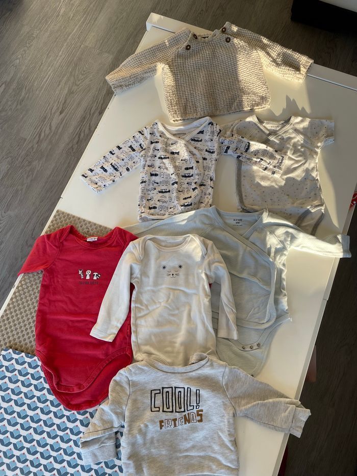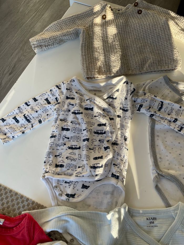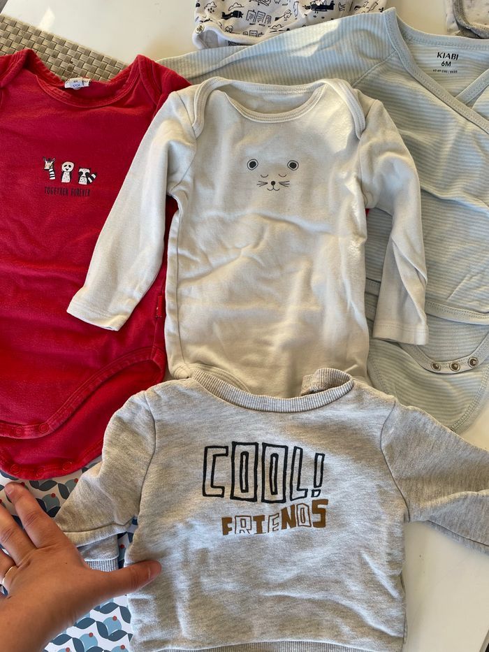 4 bodys manches longues 6 mois + 1 body manche courte + 2 pulls dont le premier cf photo un peu bouloché. Vêtements d’Occasion déjà portés et lavés. Tous les articles sont en taille 6 mois