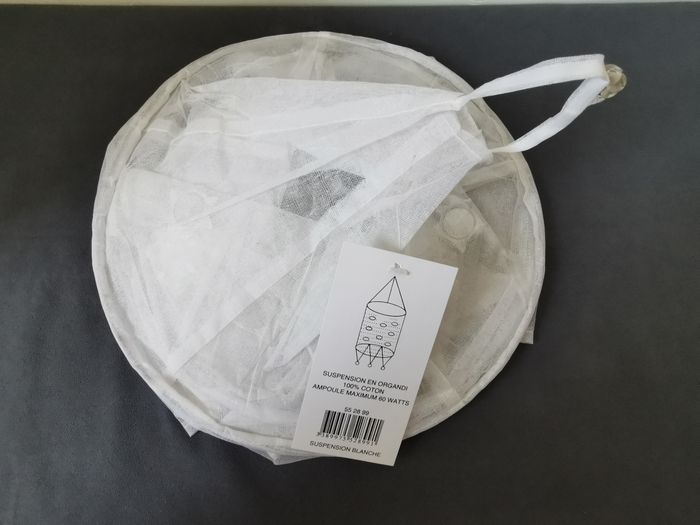 Suspension en organdi blanc Partie centrale cylindrique avec déco broderie et miroirs. 4 pointes en triangle prolongent le cylindre, terminées par petites breloques en perle. Hauteur 70 cm + 7 cm pour le lien d'accroche. Diamètre 30 cm 100% coton Neuf avec étiquette et dans son emballage d'origine. Jamais utilisé, juste déballé pour la photo. Prix d'achat 9€ #luminaire #suspension #lampion #éclairagetamisé #éclairagedoux #organdi #décomiroirs #broderies #breloquesperles #mar-taydéco #mar-taymaison