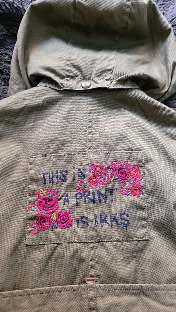 Très joli trench avec broderies au dos Capuche amovible grâce aux pressions Trace de prénom au dessus de l'étiquette ikks