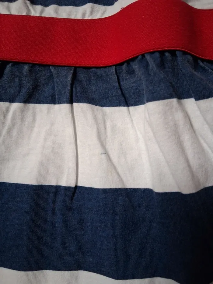 Très bon état, sans manches, à rayures bleues marine et blanche, petite trace de feutre en bas, voir dernière photo, écritures minnie rouge à paillettes