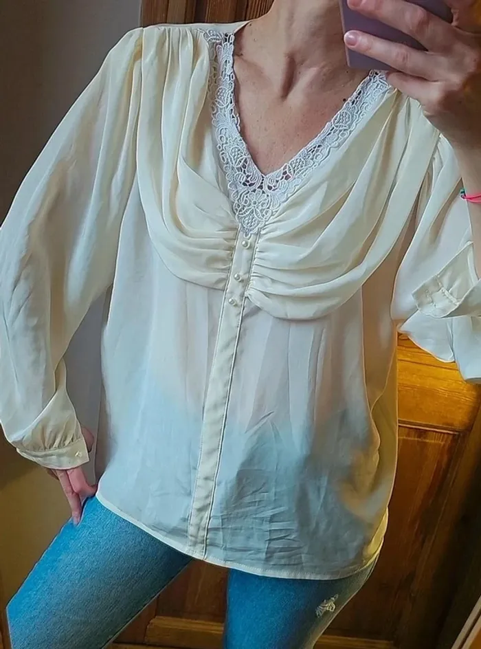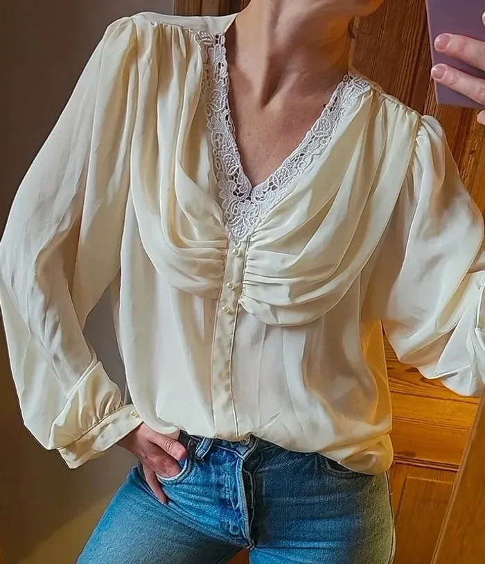 💫Blouse vintage crème broderie made in France 💫Très bon état, micros tâches poignets 💫Réductions sur lots appliquées -10% dès 2 articles achetés -15% dès 3 articles achetés -20% dès 5 articles achetés #vintagelook #vintage #femme #vinted #donna #aesthetic #rock #vintedpro #camisa #90s #y2k #retro #broderie #chic #evening #ladylike #cottagecore #fairycore #collavalliere #madeinfrance #fripsixteen #blouse