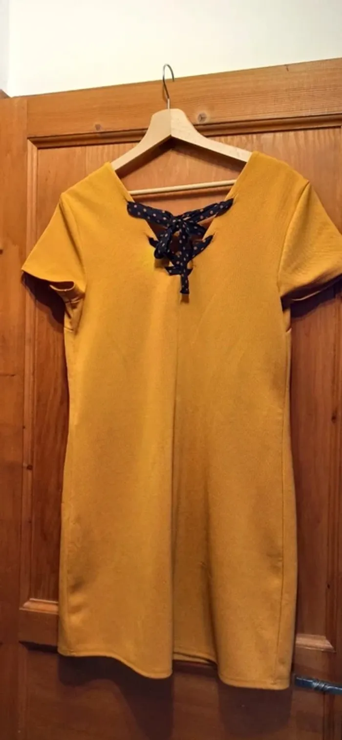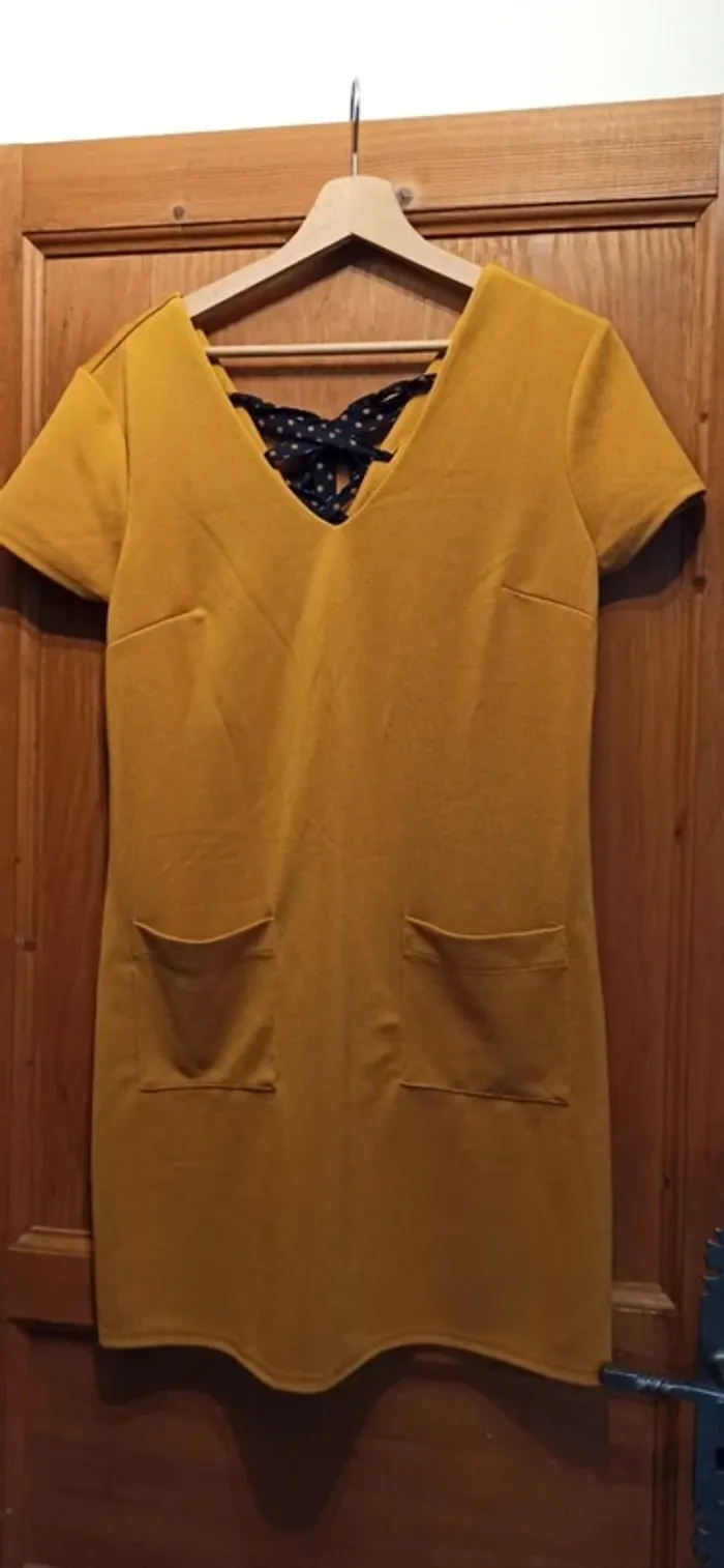Robe courte, noeud dans le dos avec deux poches à l'avant. Petite imperfection au bas du dos (visible sur photo) #eloetgui_femme_taille36 #robecourte36