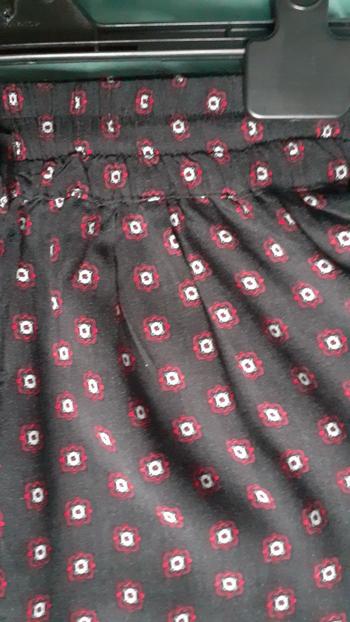 Vends un pantalon fluide en viscose, petit revers à la base, ceinture élastique, 2 poches latérales, fond noir avec motifs blanc et rouge, marque Etam, taille 38. Longueur entrejambe : 75 cm Largeur de la ceinture à plat : 33 cm Largeur au niveau des hanches : 58 cm.