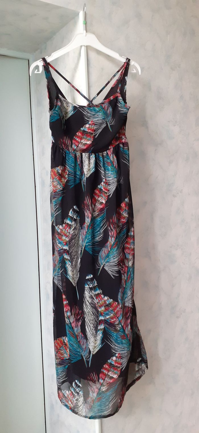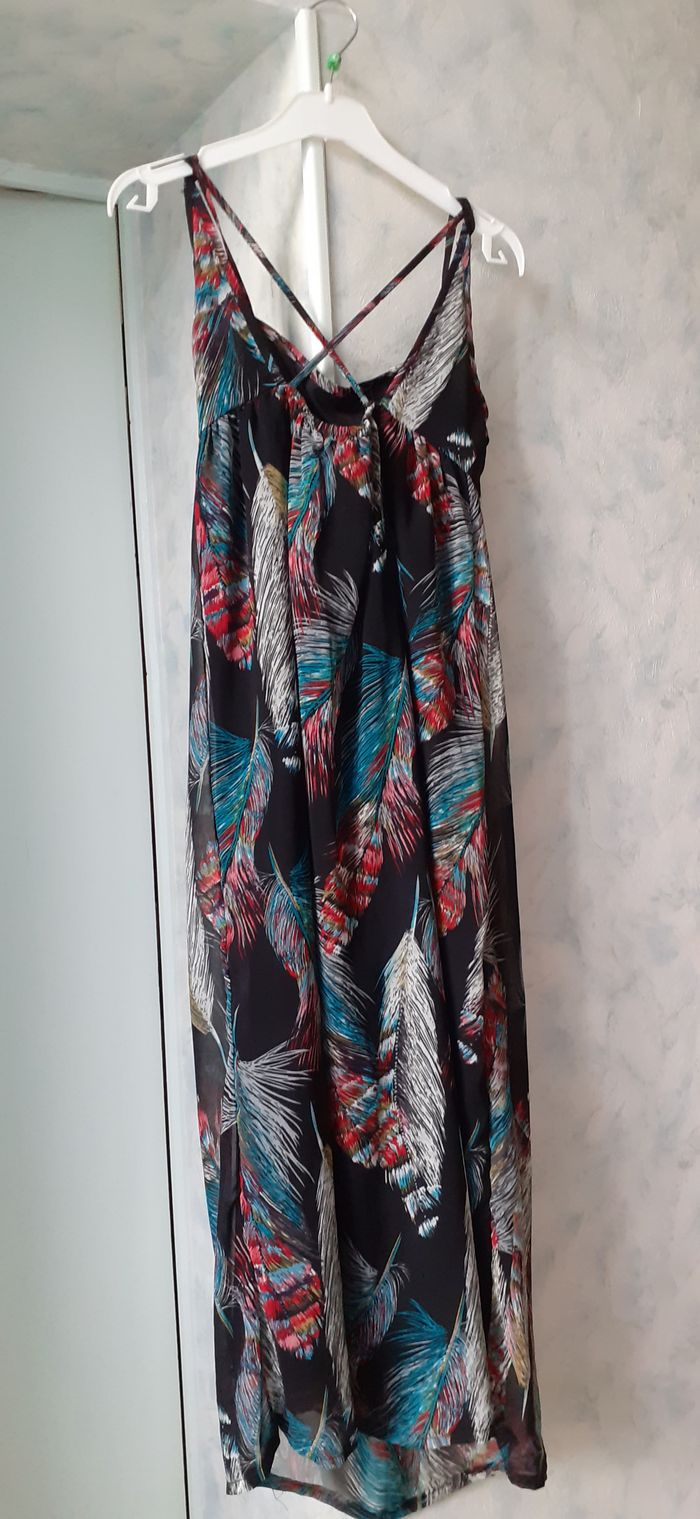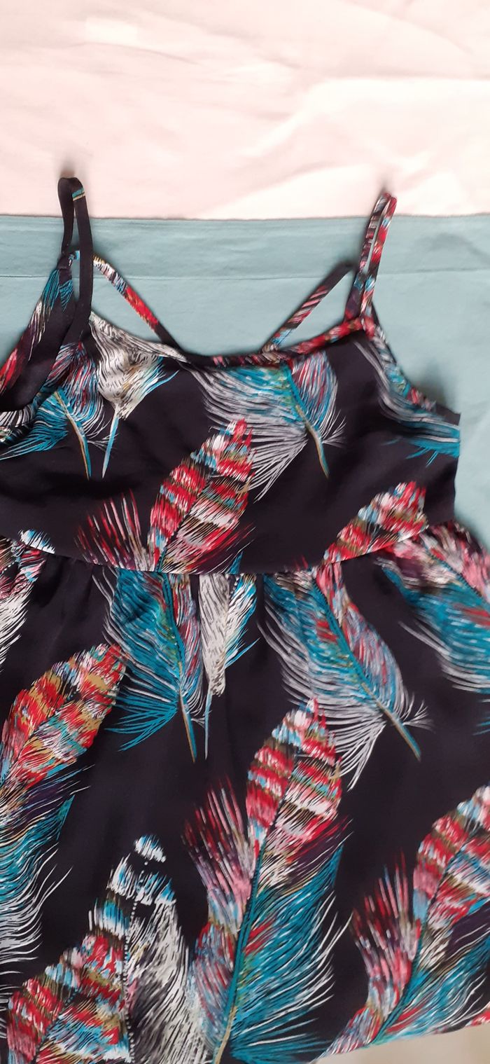 Vends une robe à bretelles fines croisées dans le dos, en voile polyester, doublée, élastique dans le dos, couleur noir avec plumes multicolores, taille 36 EUR. Longueur sous aisselle : 106 cm Largeur aisselle à aisselle : 38 cm.