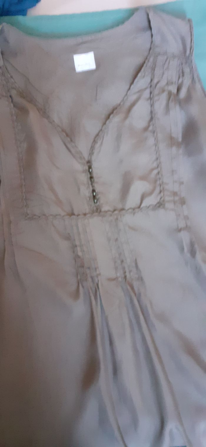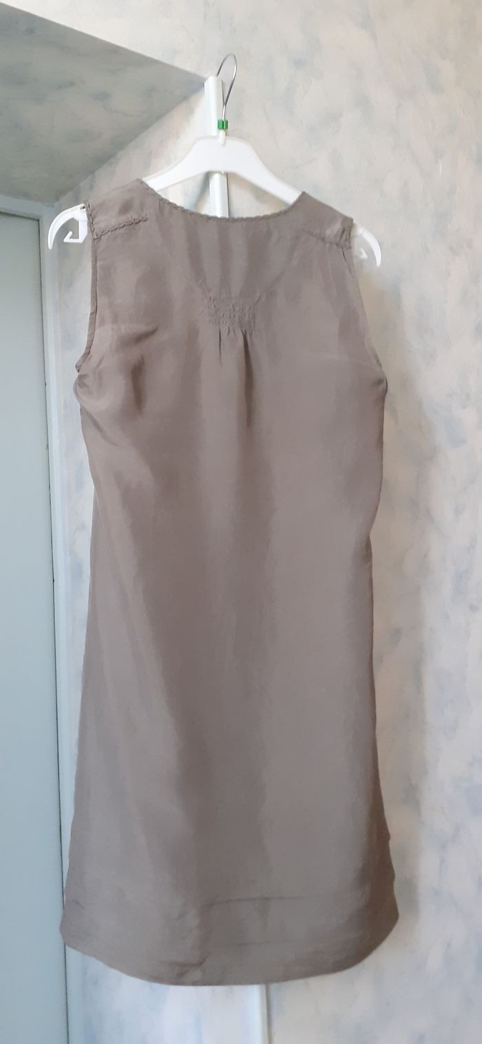 Vends une robe sans manche, en soie, encolure en V avec petits boutons, couleur kaki uni, marque Camaïeu, taille 38. Longueur dans le dos : 85 cm Largeur aisselle à aisselle : 44 cm.