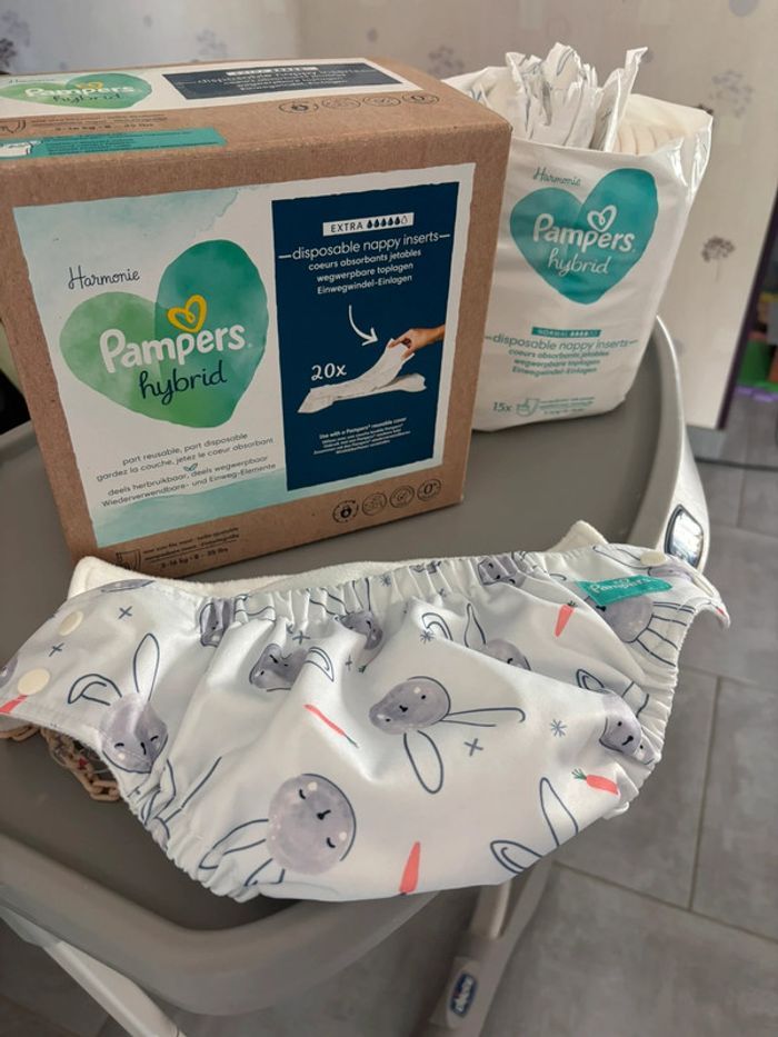 Couche lavable Pampers + avec ses recharges (couches absorbantes jetables) : 1 paquet de 20 et 1 paquet de 14 pour bébé de 3 à 16kg Etat neuf jamais utilisé.